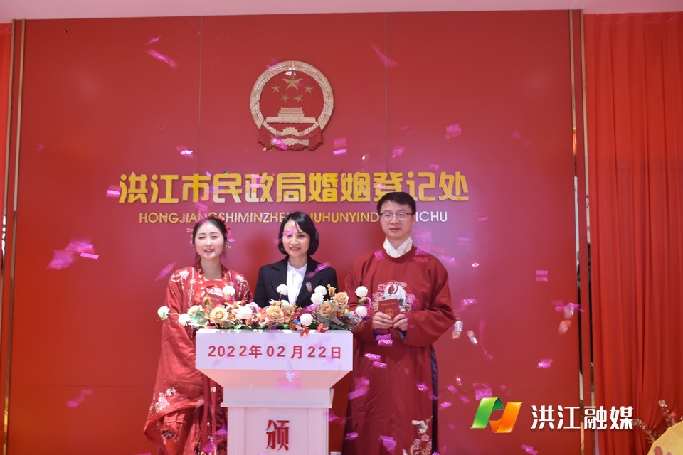 2022年2月22日,在这个充满“爱”的日子里,一对新人吴先生、易女士在民政局主要负责人的主持下,在工作人员及亲朋好友的共同见证下,向着庄严的国旗国徽宣读结婚誓言,正式步入婚姻的幸福殿堂。