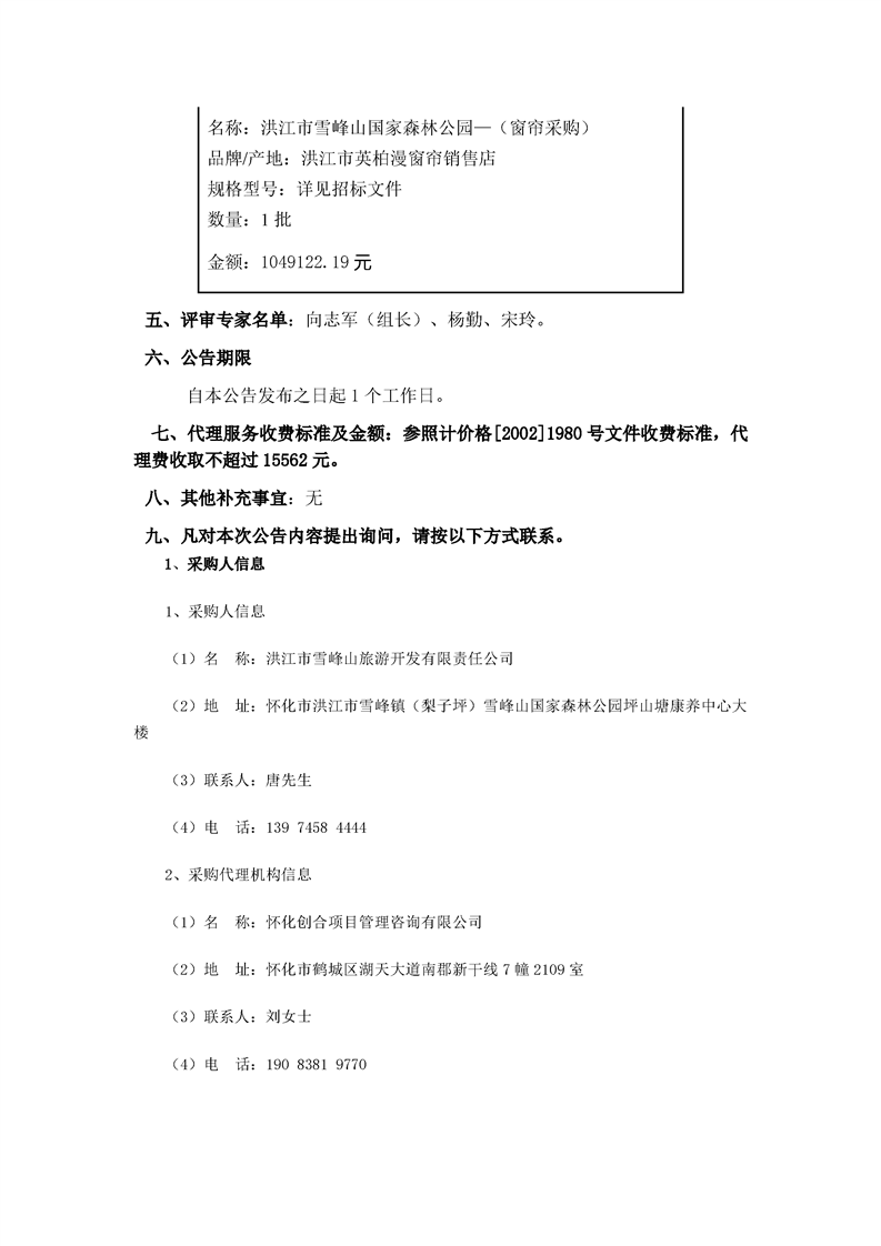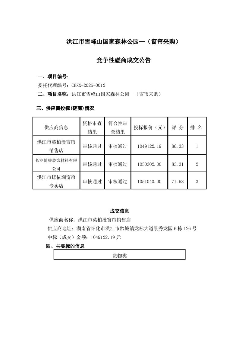 洪江市雪峰山国家森林公园—(窗帘采购)竞争性磋商成交公告