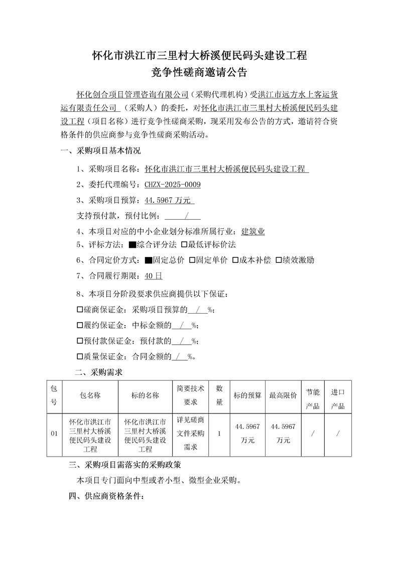 怀化市洪江市三里村大桥溪便民码头建设工程竞争性磋商邀请公告