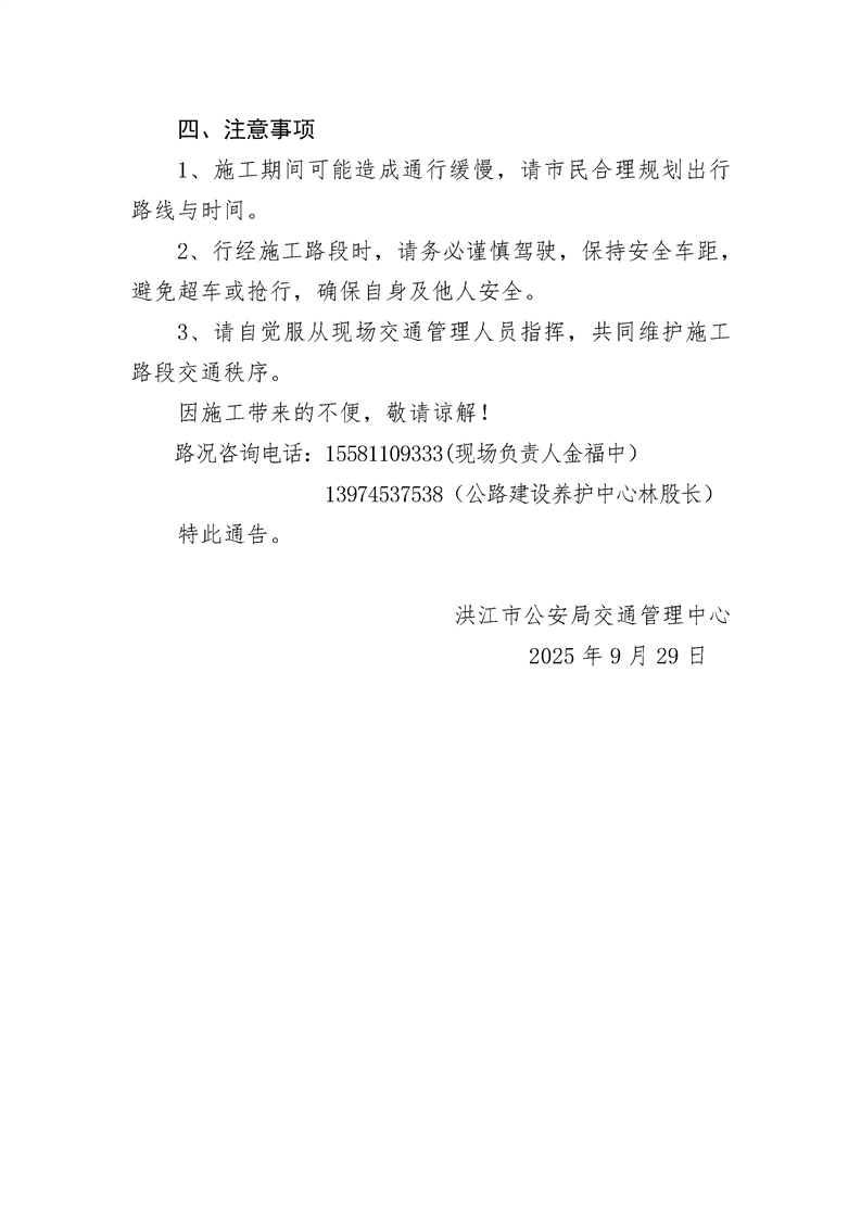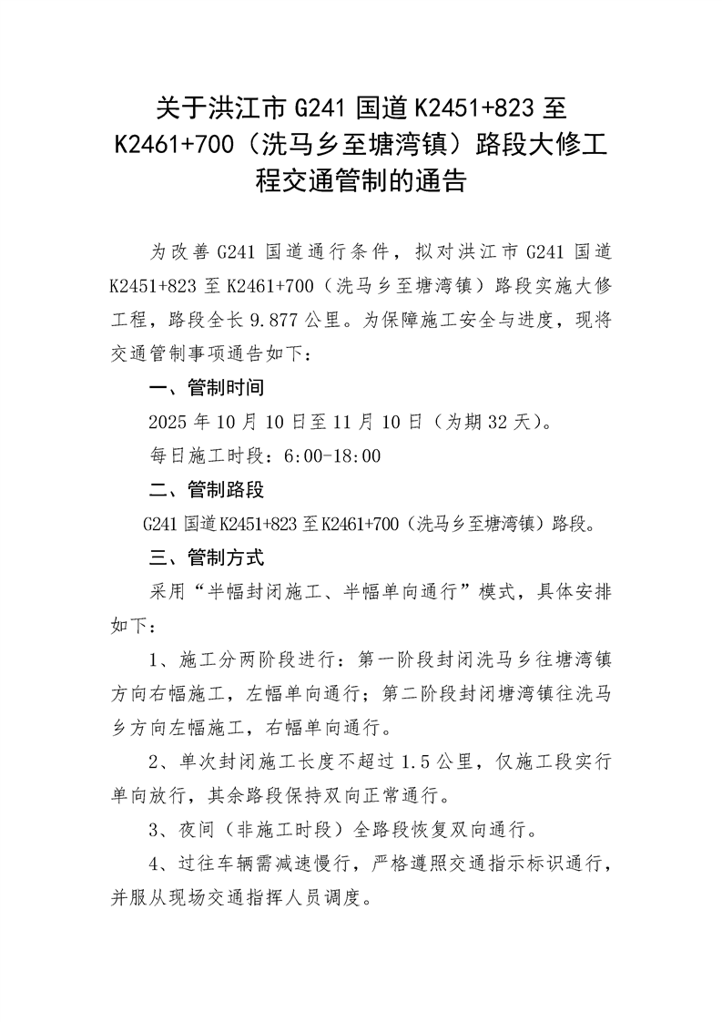 关于洪江市G241国道K2451+823至K2461+700(洗马乡至塘湾镇)路段大修工程交通管制的通告
