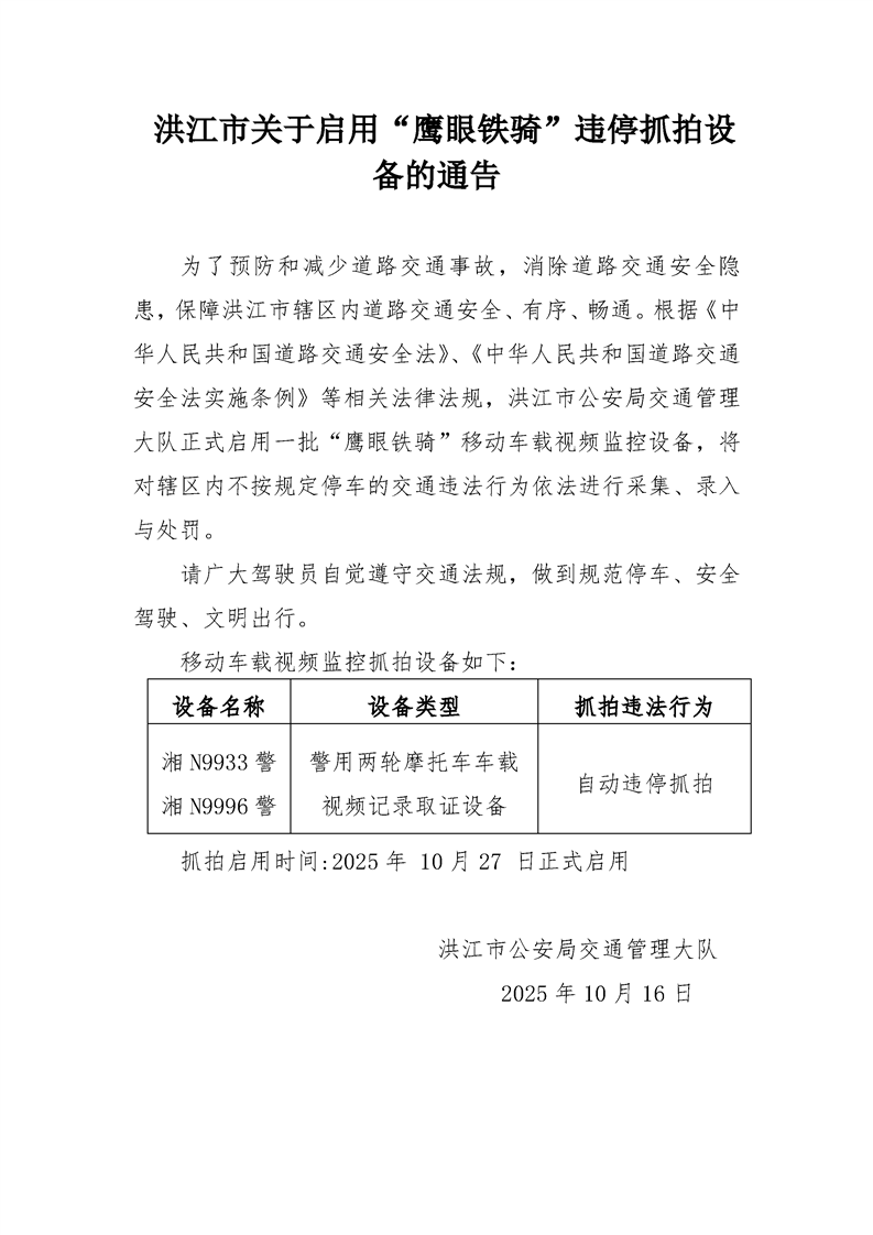 洪江市关于启用“鹰眼铁骑”违停抓拍设备的通告