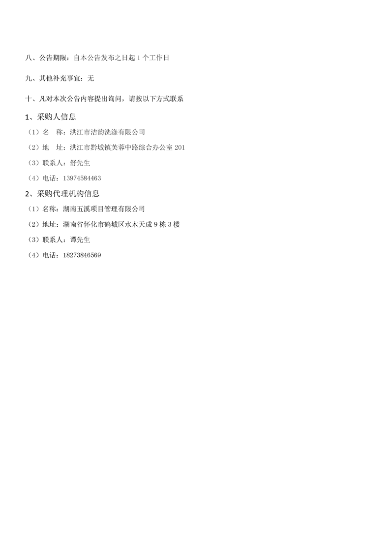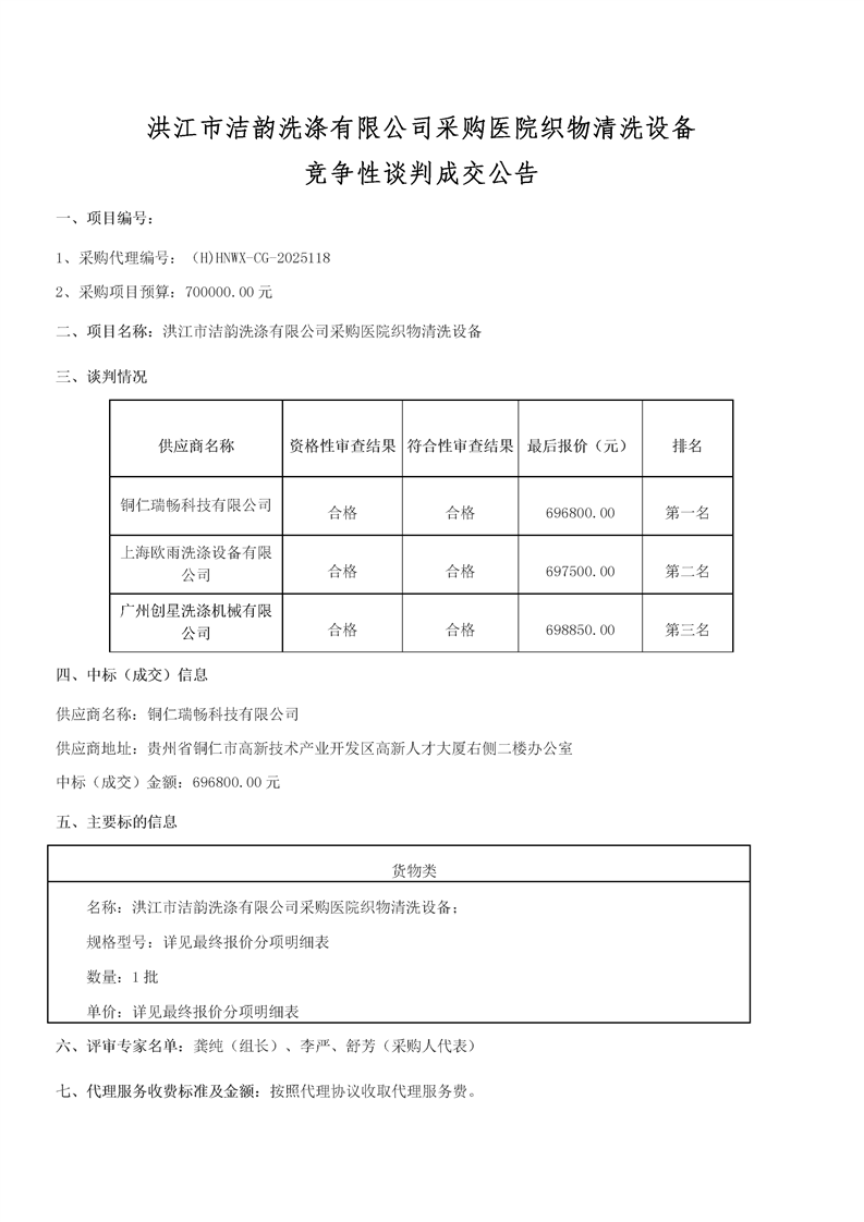 洪江市洁韵洗涤有限公司采购医院织物清洗设备竞争性谈判成交公告