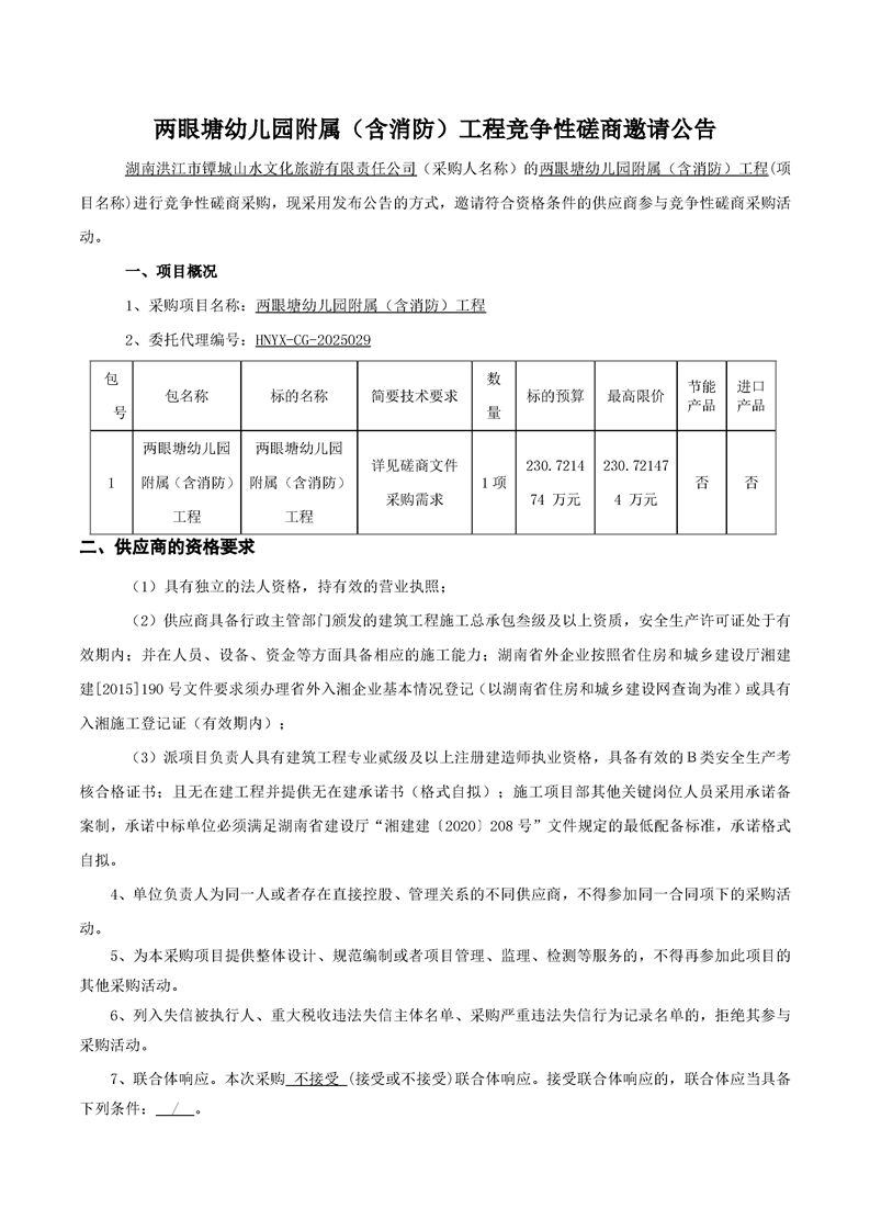 两眼塘幼儿园附属(含消防)工程竞争性磋商邀请公告