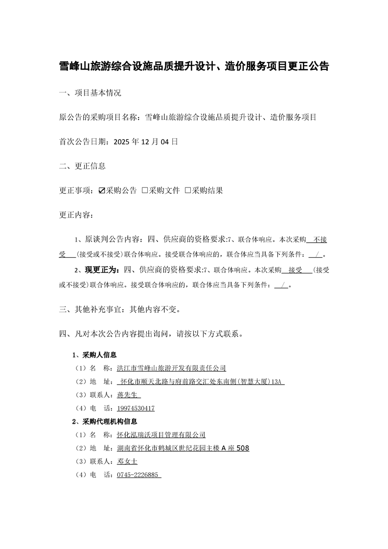 雪峰山旅游综合设施品质提升设计、造价服务项目更正公告