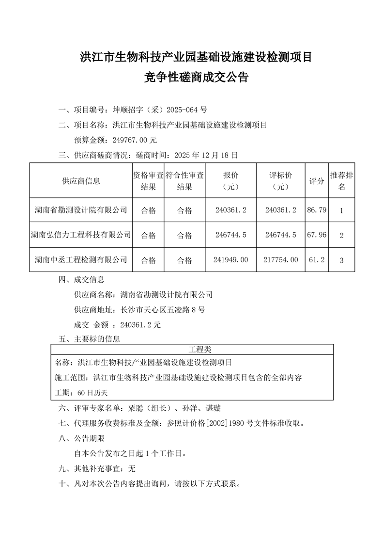 洪江市生物科技产业园基础设施建设检测项目竞争性磋商成交公告