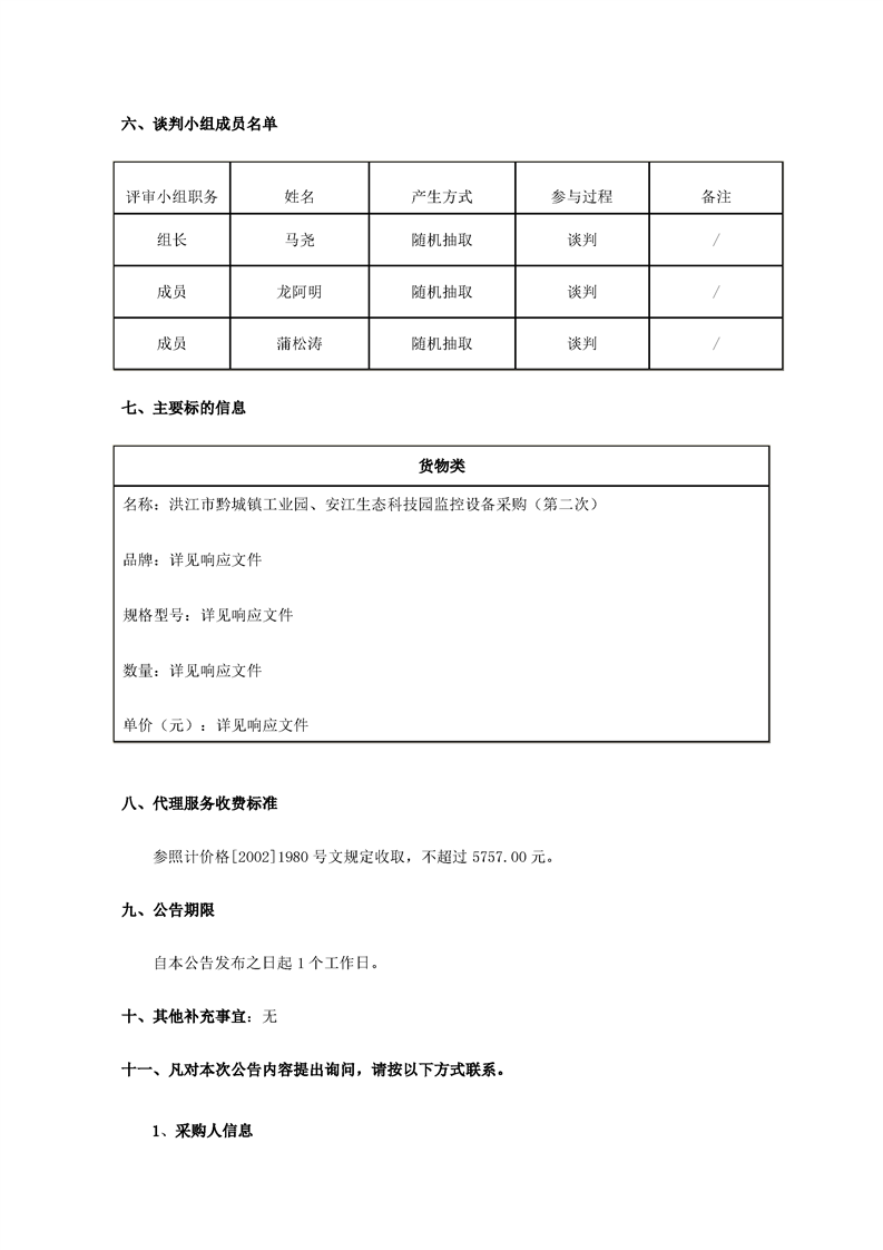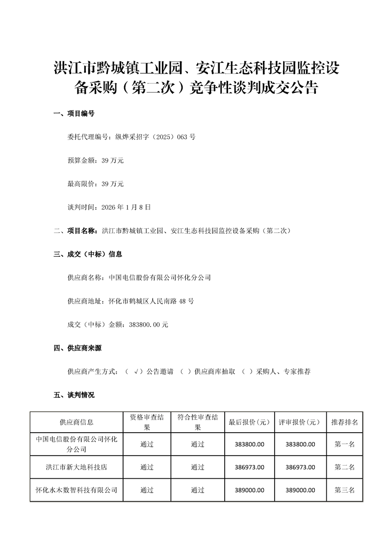 洪江市黔城镇工业园、安江生态科技园监控设备采购(第二次)竞争性谈判成交公告