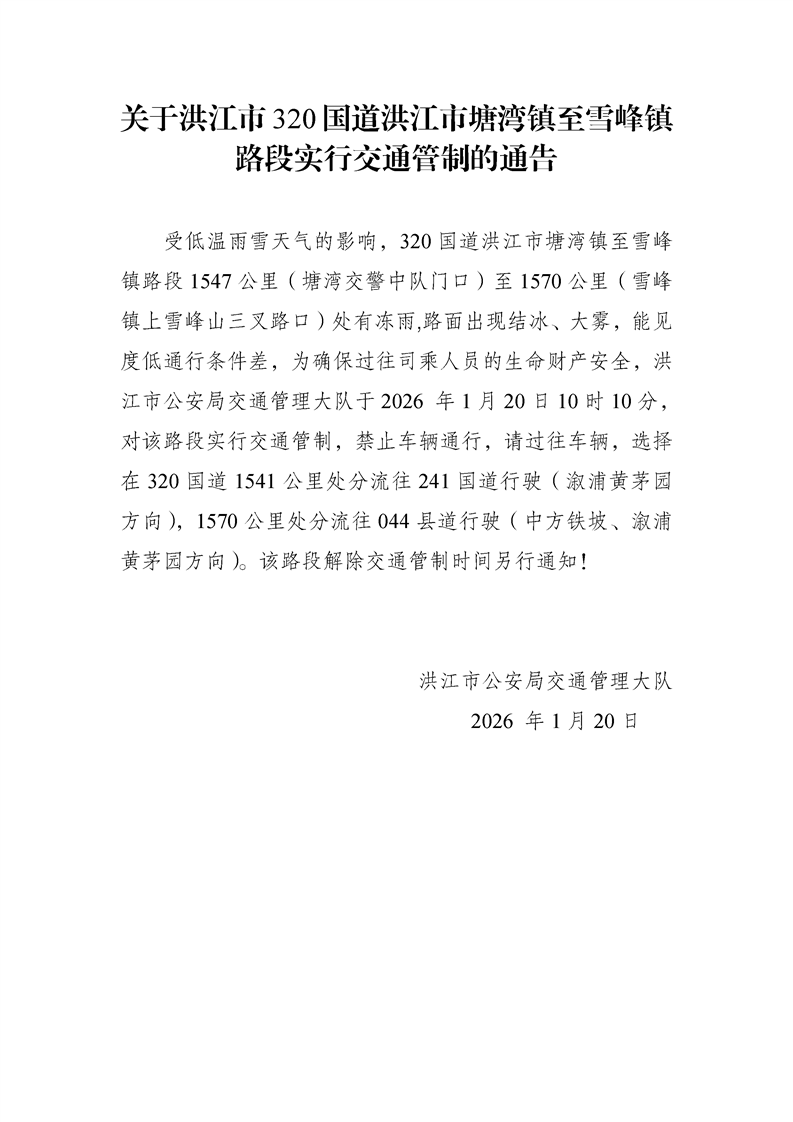 关于洪江市320国道洪江市塘湾镇至雪峰镇路段实行交通管制的通告
