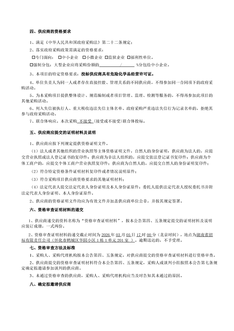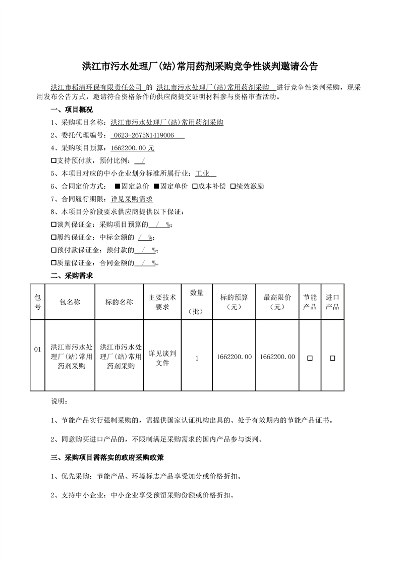 洪江市污水处理厂(站)常用药剂采购竞争性谈判邀请公告