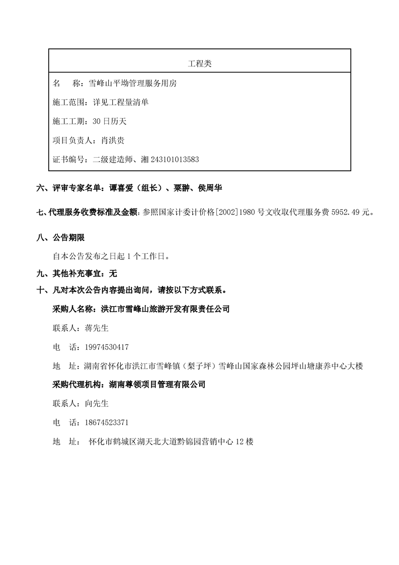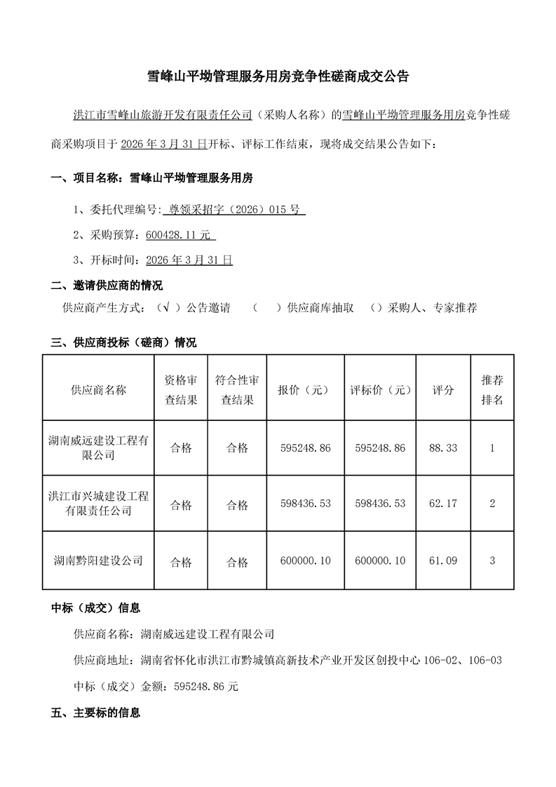 雪峰山平坳管理服务用房竞争性磋商成交公告