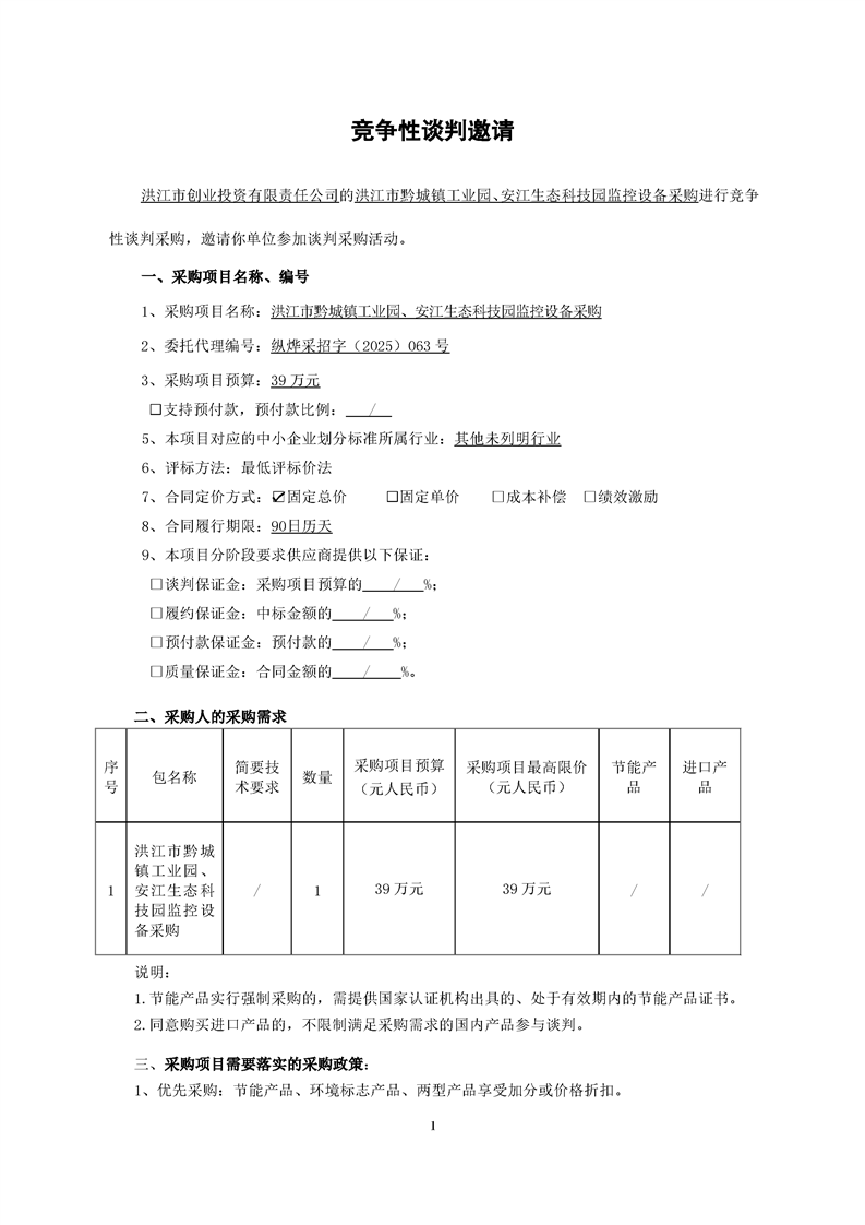 洪江市黔城镇工业园、安江生态科技园监控设备采购竞争性谈判邀请公告