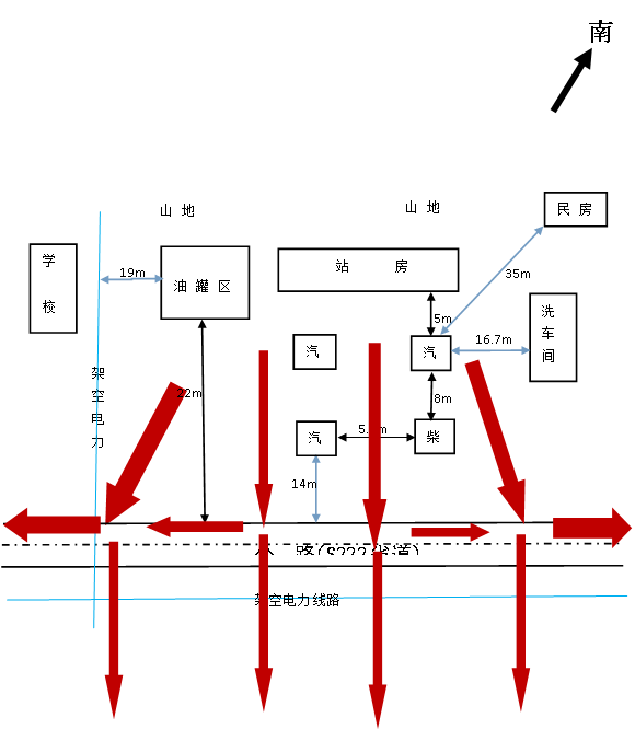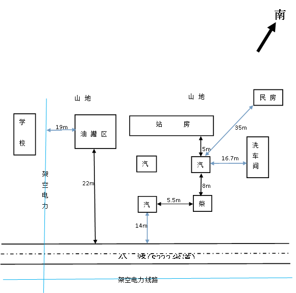 洪江市硖洲供销合作社加油站加油站坐东南朝西北。站房的东南面距加油机35米有一民房;南面为空闲地;西面距加油机14米为S222省道,距加油机36米有一架空电力线路;北面距油罐19米有一架空电力线路,距油罐48米为硖洲乡中心学校围墙。