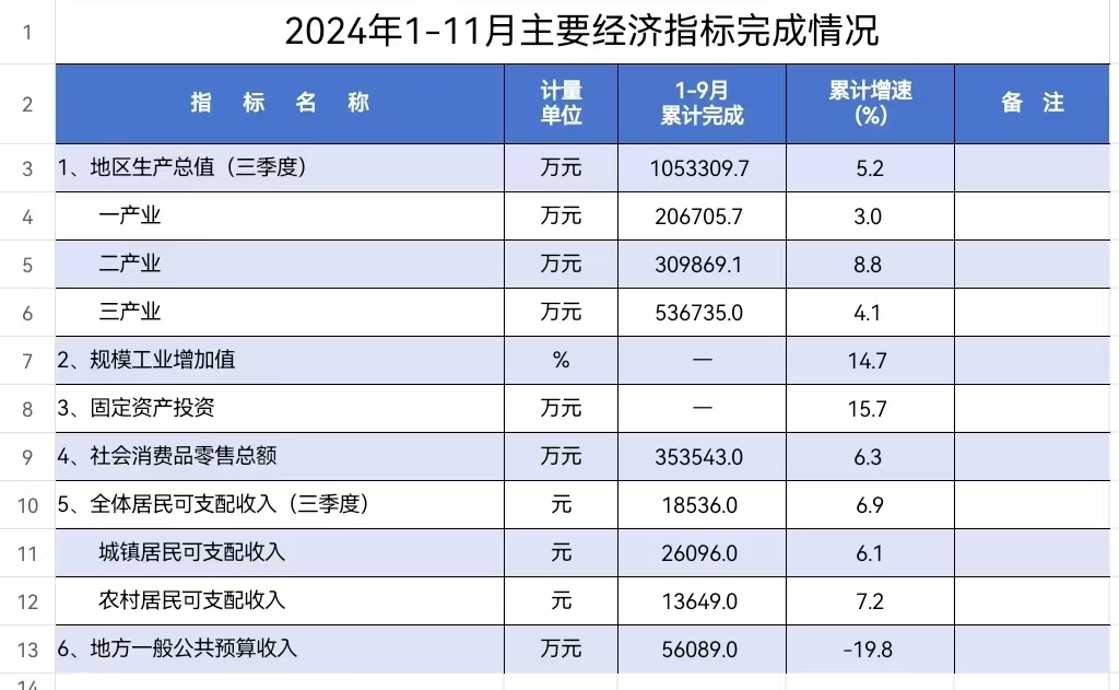 洪江市2024年1-11月主要经济指标完成情况