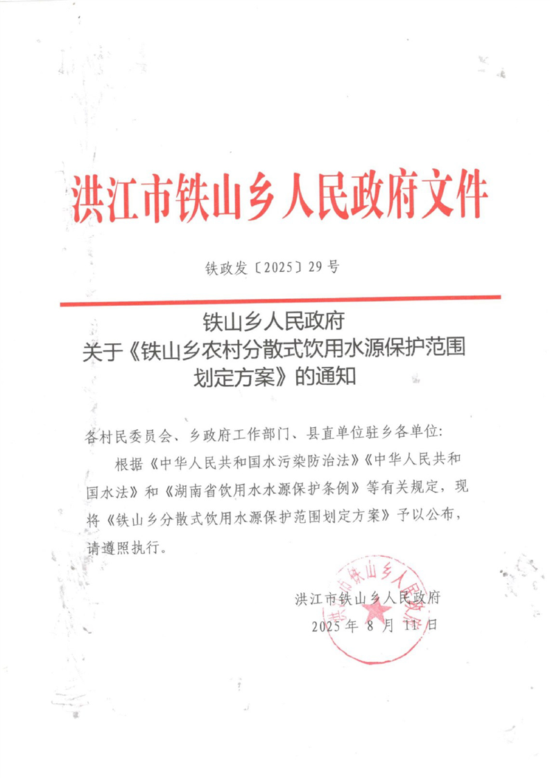 关于公布《铁山乡分散式饮用水源保护范围划定方案》的通知 铁政发〔2025〕29号