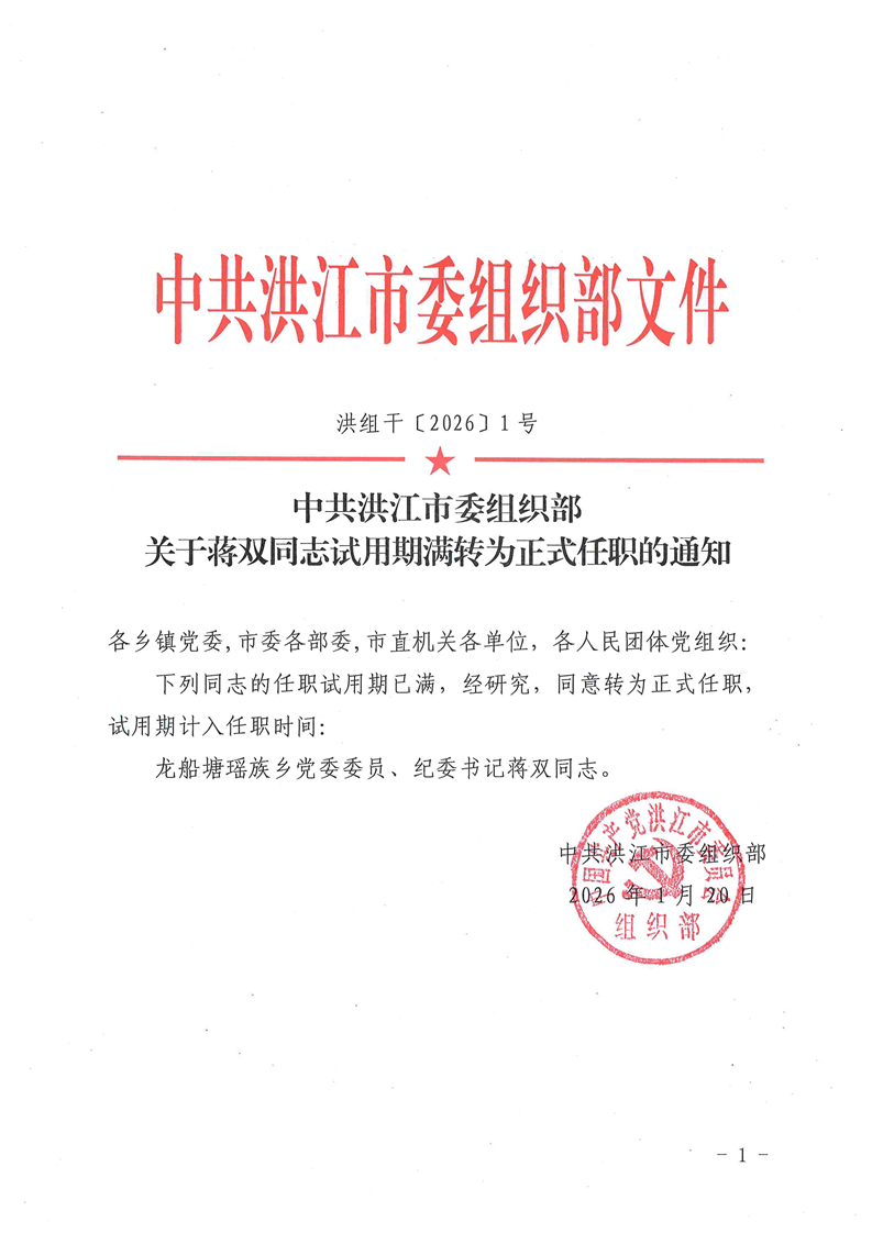 中共洪江市委组织部关于蒋双同志试用期满转为正式任职的通知