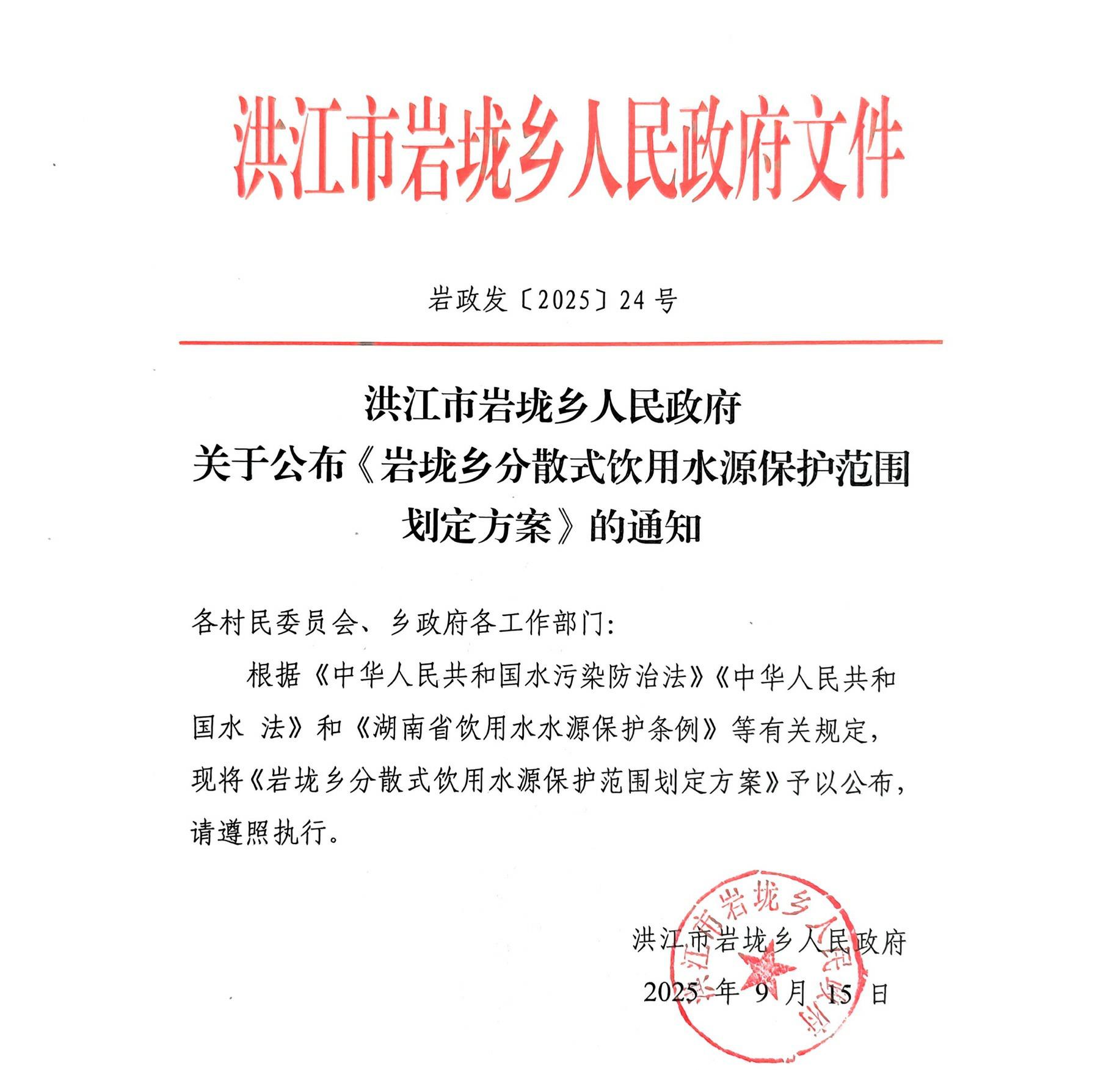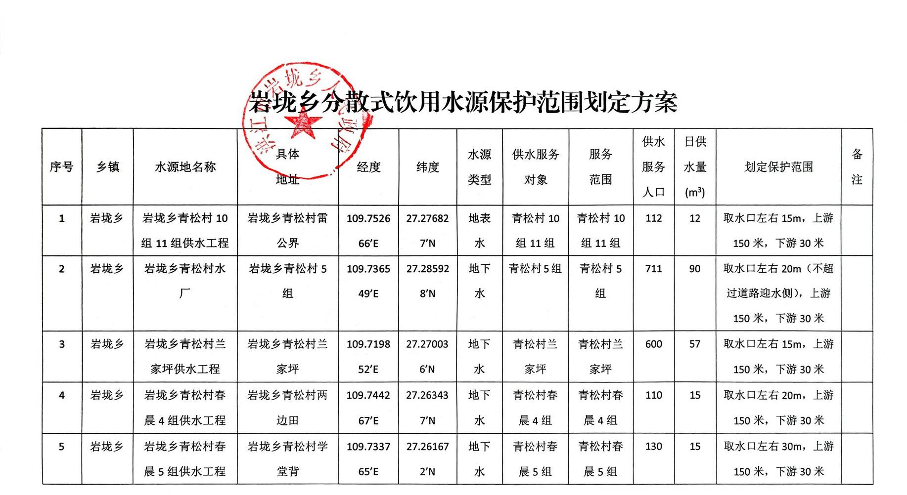 关于公布《岩垅乡分散式饮用水源保护范围划定方案》的通知