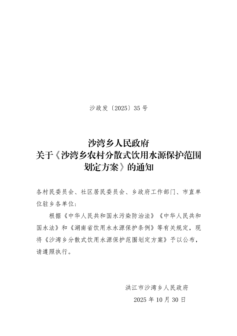 关于《沙湾乡农村分散式饮用水源保护范围划定方案》的通知