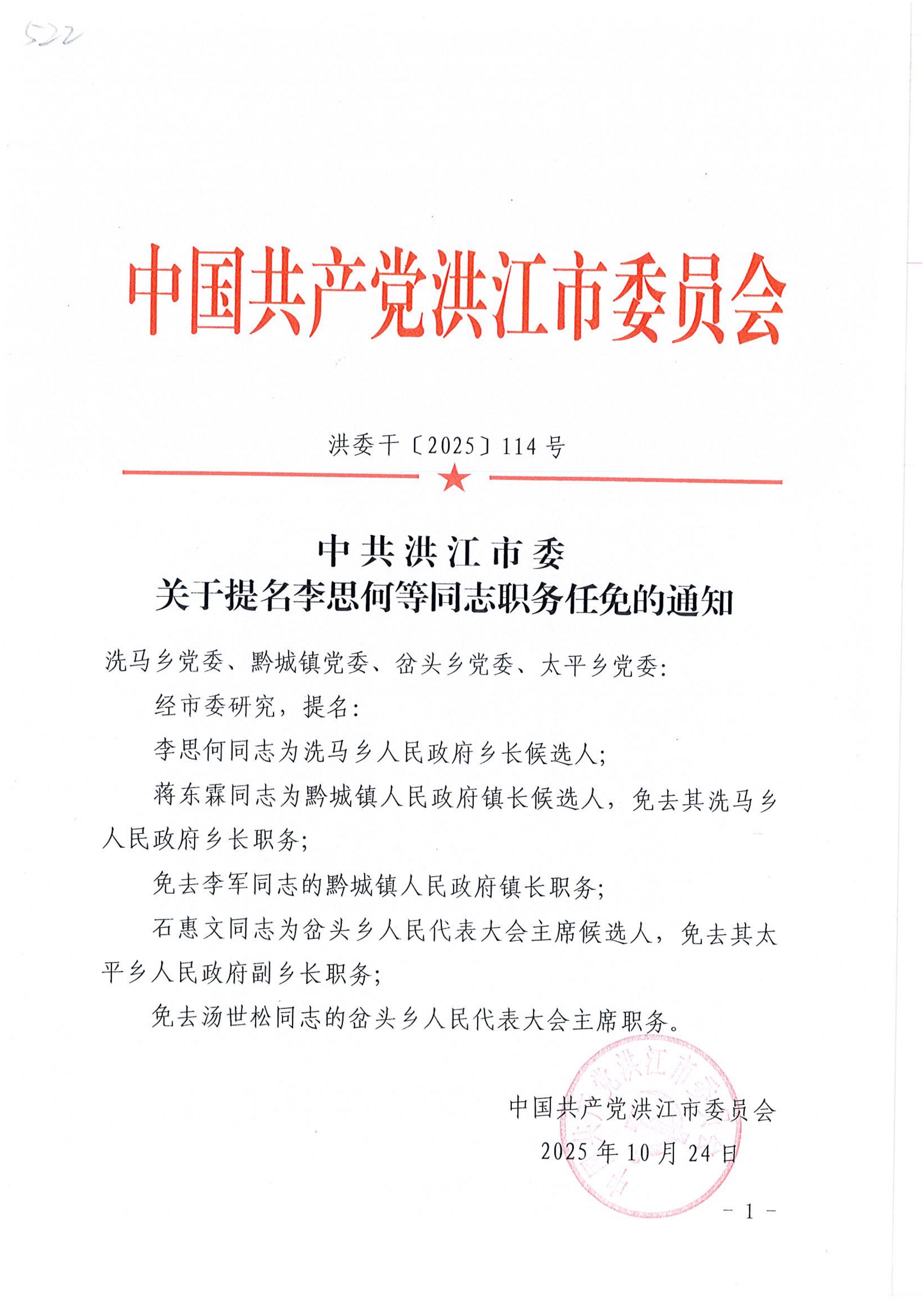 中共洪江市委关于提名李思何等同志职务任免的通知 洪委干〔2025〕114号
