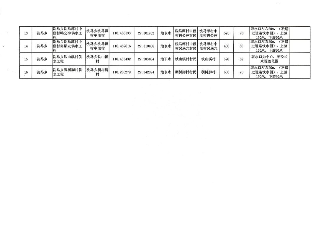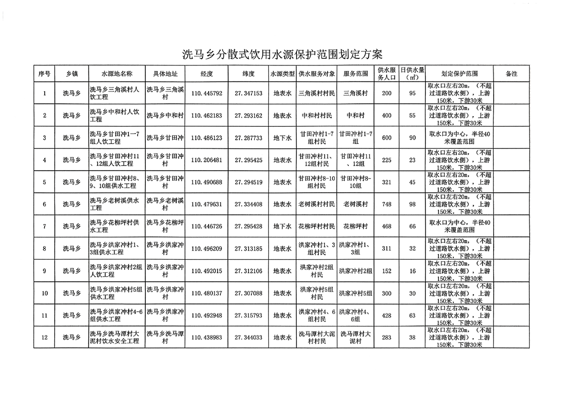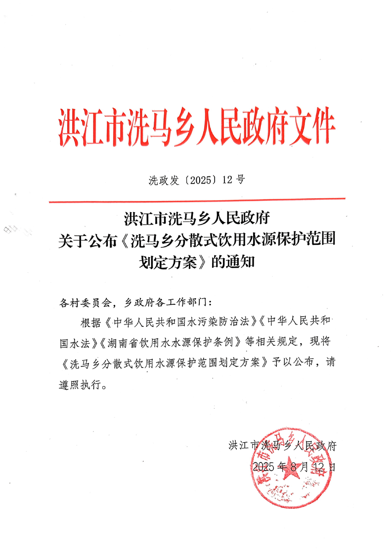 洪江市洗马乡人民政府关于公布《洗马乡分散式饮用水源保护范围划定的方案》的通知