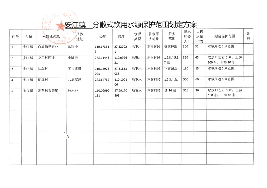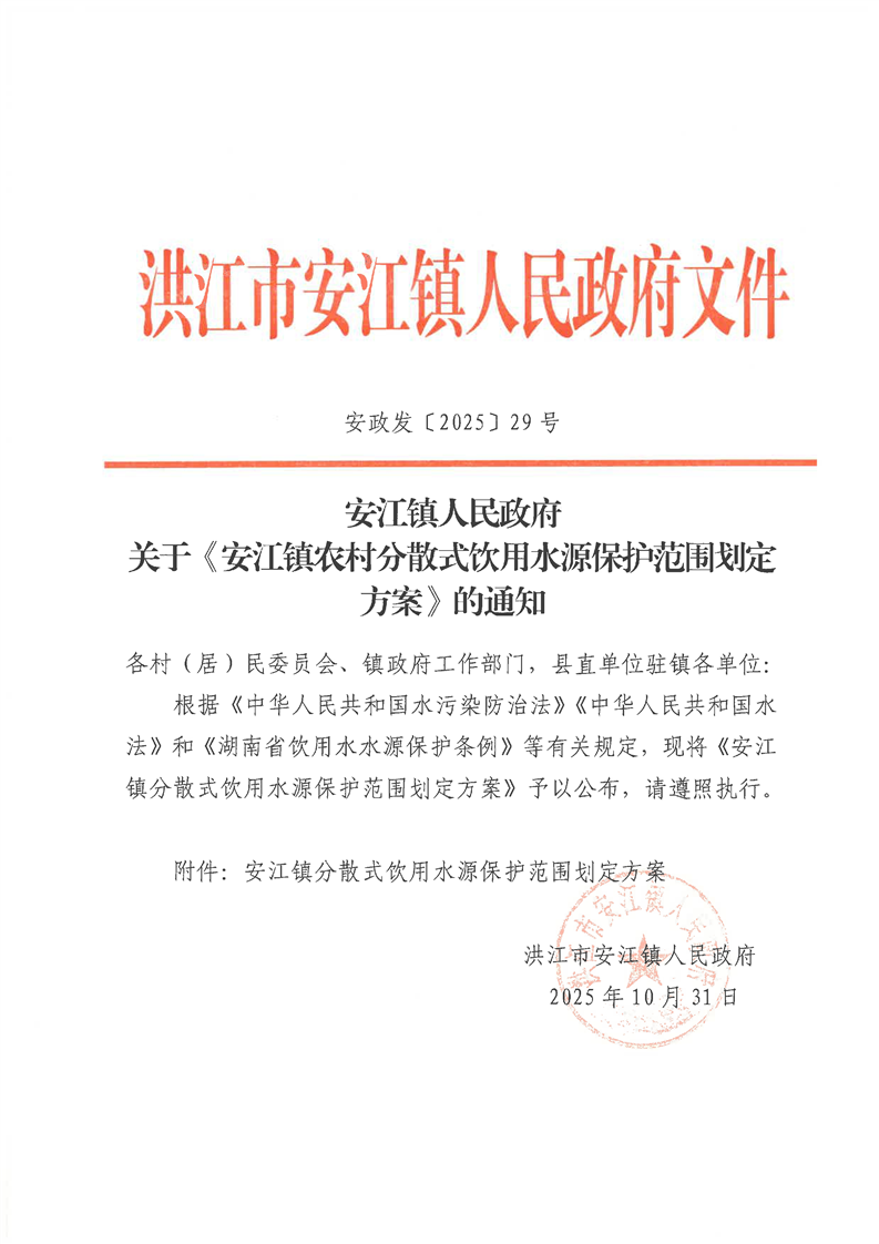 关于《安江镇农村分散式饮用水源保护范围划定方案》的通知