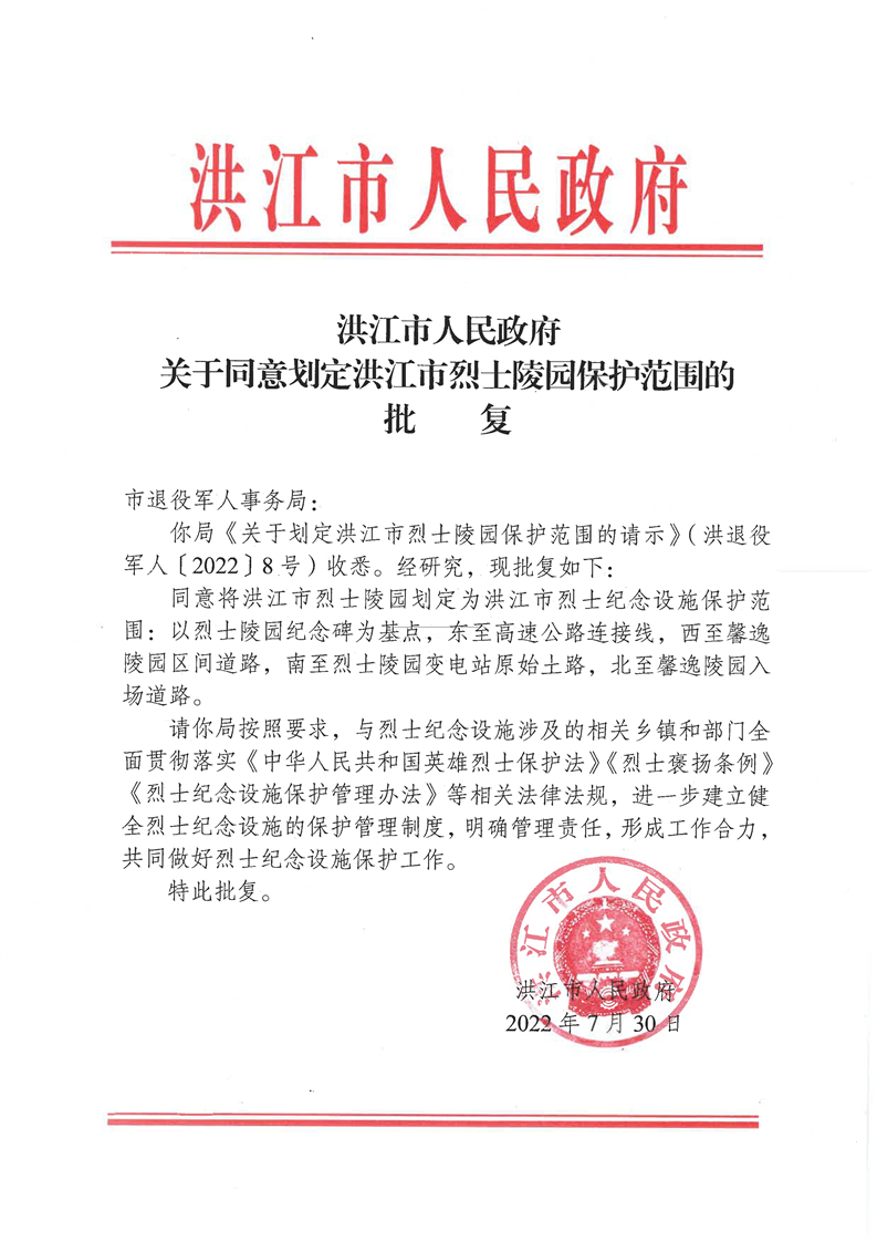 洪江市人民政府关于同意划定洪江市烈士陵园保护范围的批复