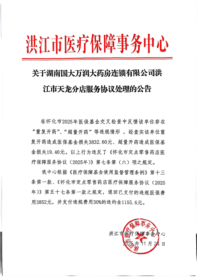 关于湖南国大万润大药房连锁有限公司洪江市天龙分店服务协议处理的公告