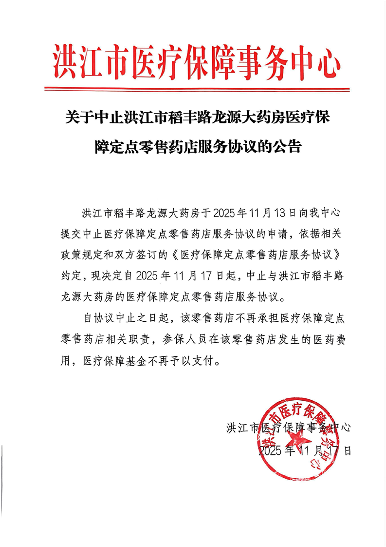 关于中止洪江市稻丰路龙源大药房医疗保障定点零售药店服务协议的公告