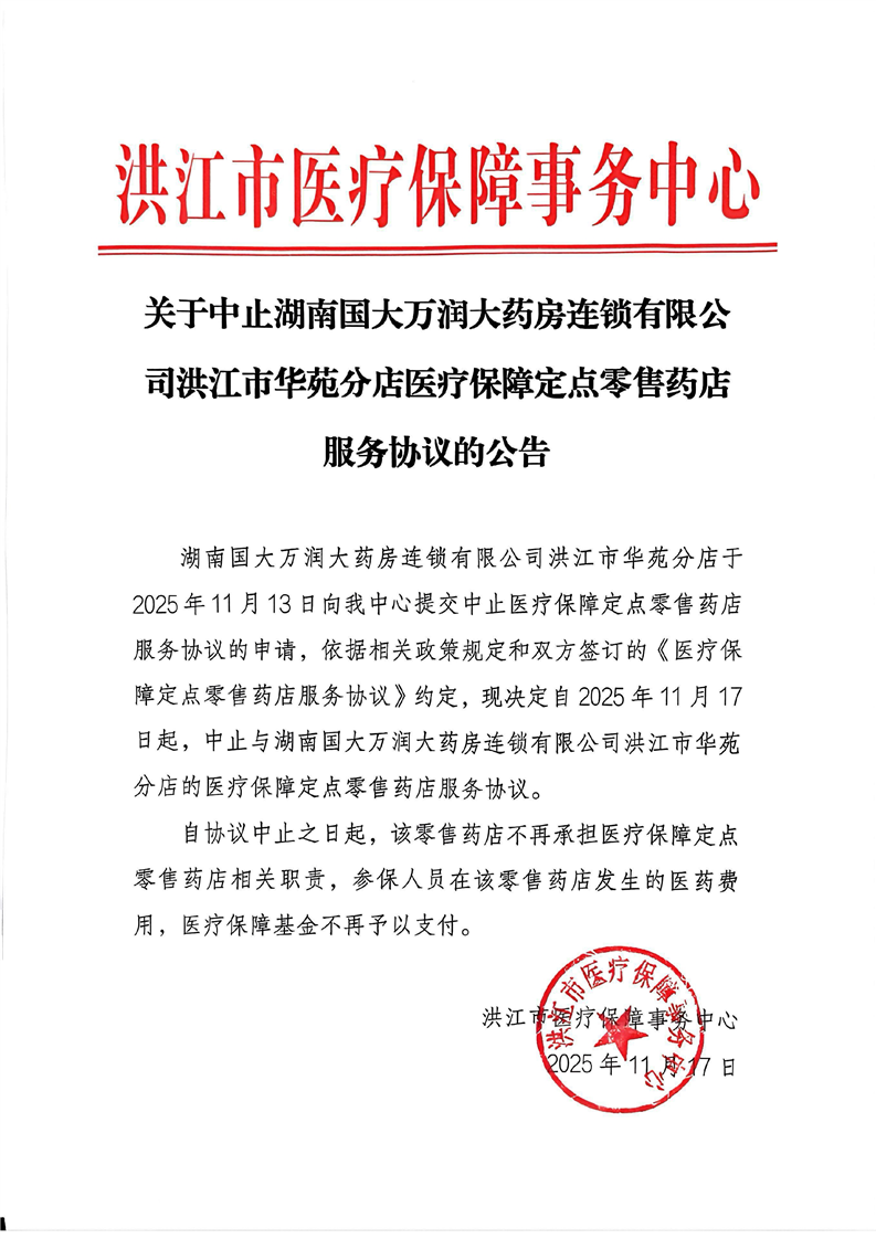 关于中止湖南国大万润大药房连锁有限公司洪江市华苑分店医疗保障定点零售药店服务协议的公告