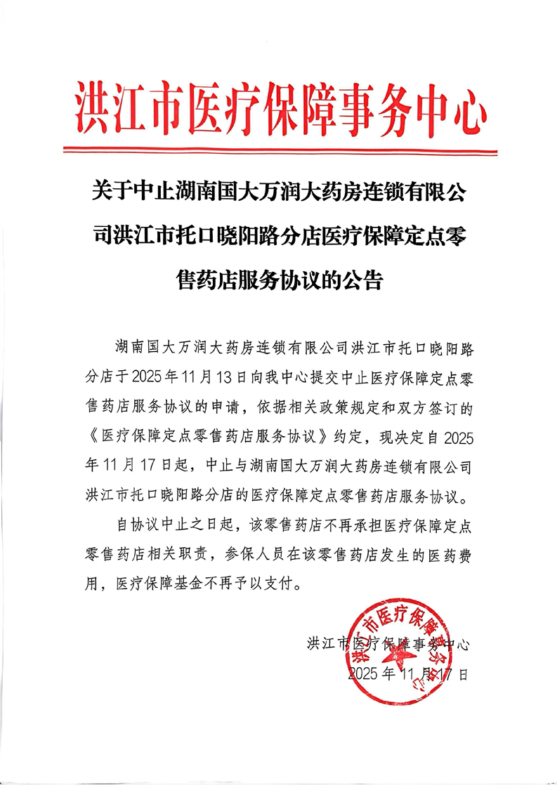 关于中止湖南国大万润大药房连锁有限公司洪江市托口晓阳路分店医疗保障定点零售药店服务协议的公告