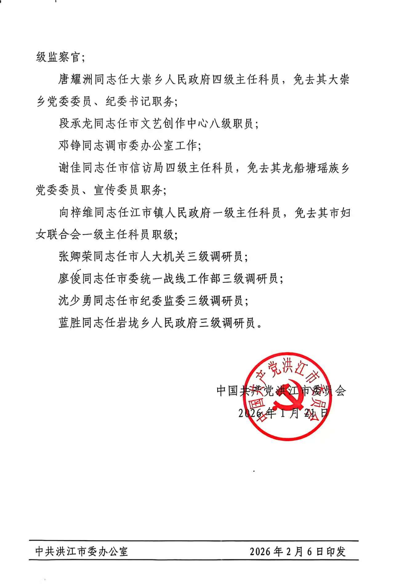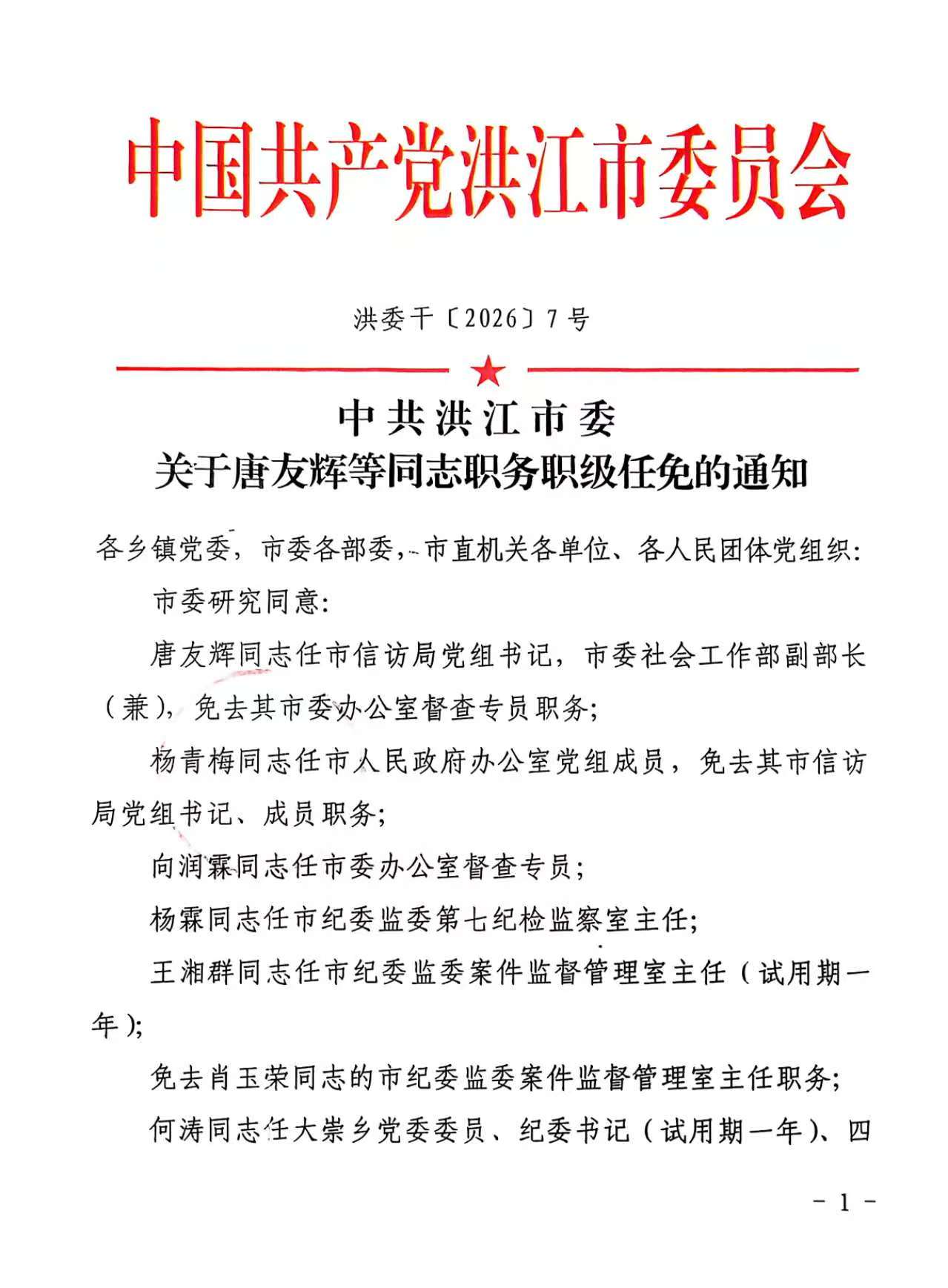 关于唐友辉同志职务职级任免的通知