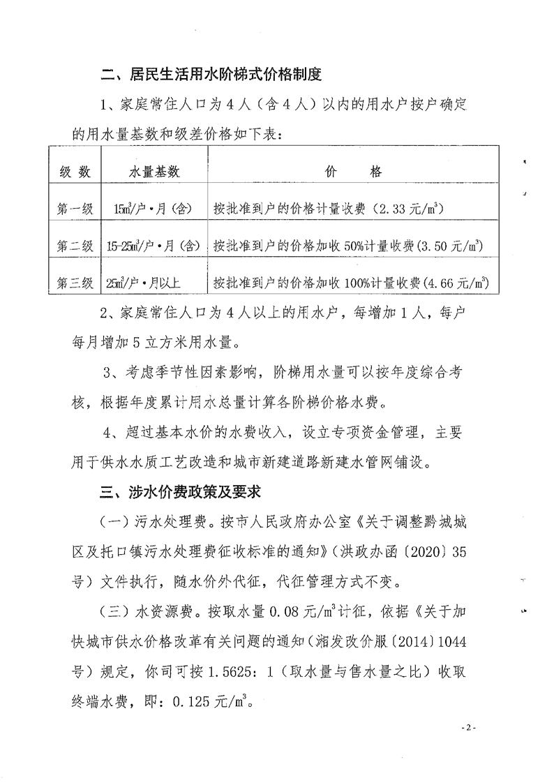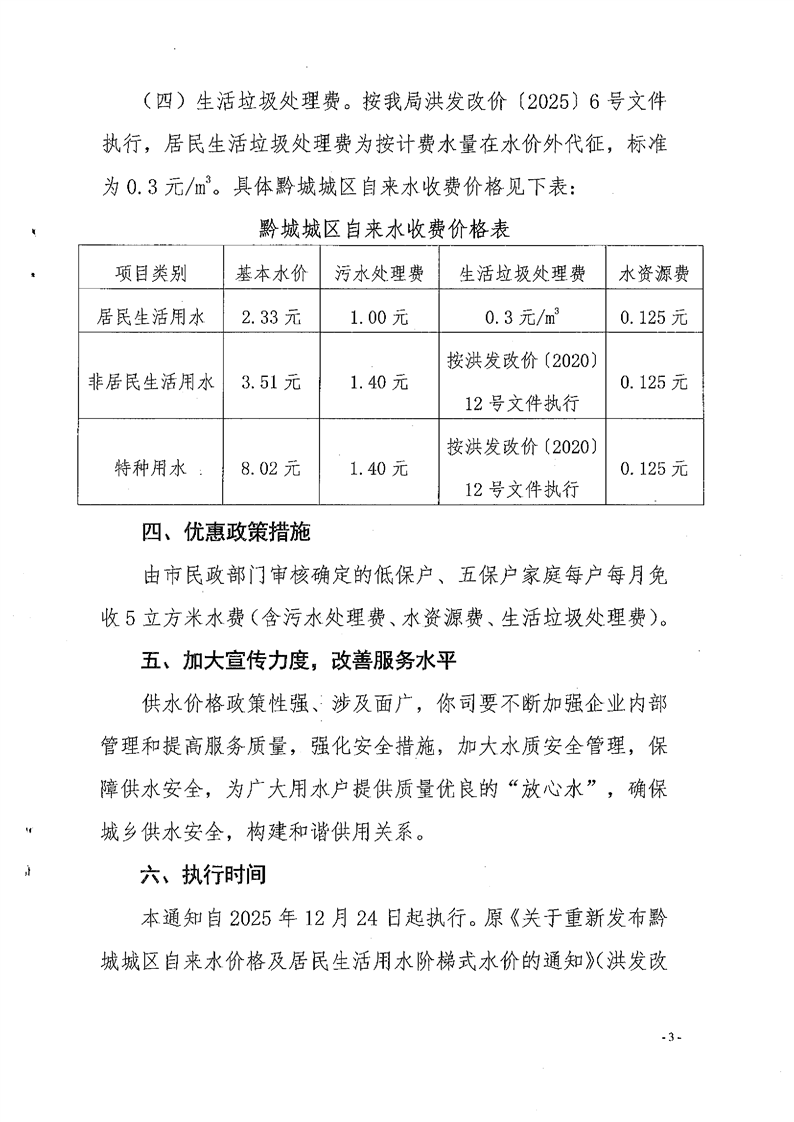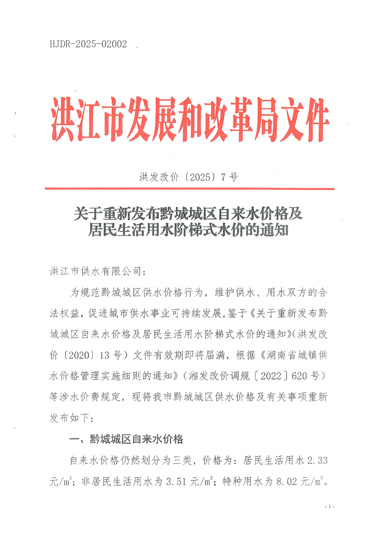 关于重新发布黔城城区自来水价格及居民生活用水阶梯式水价的通知 洪发改价(2025)7号