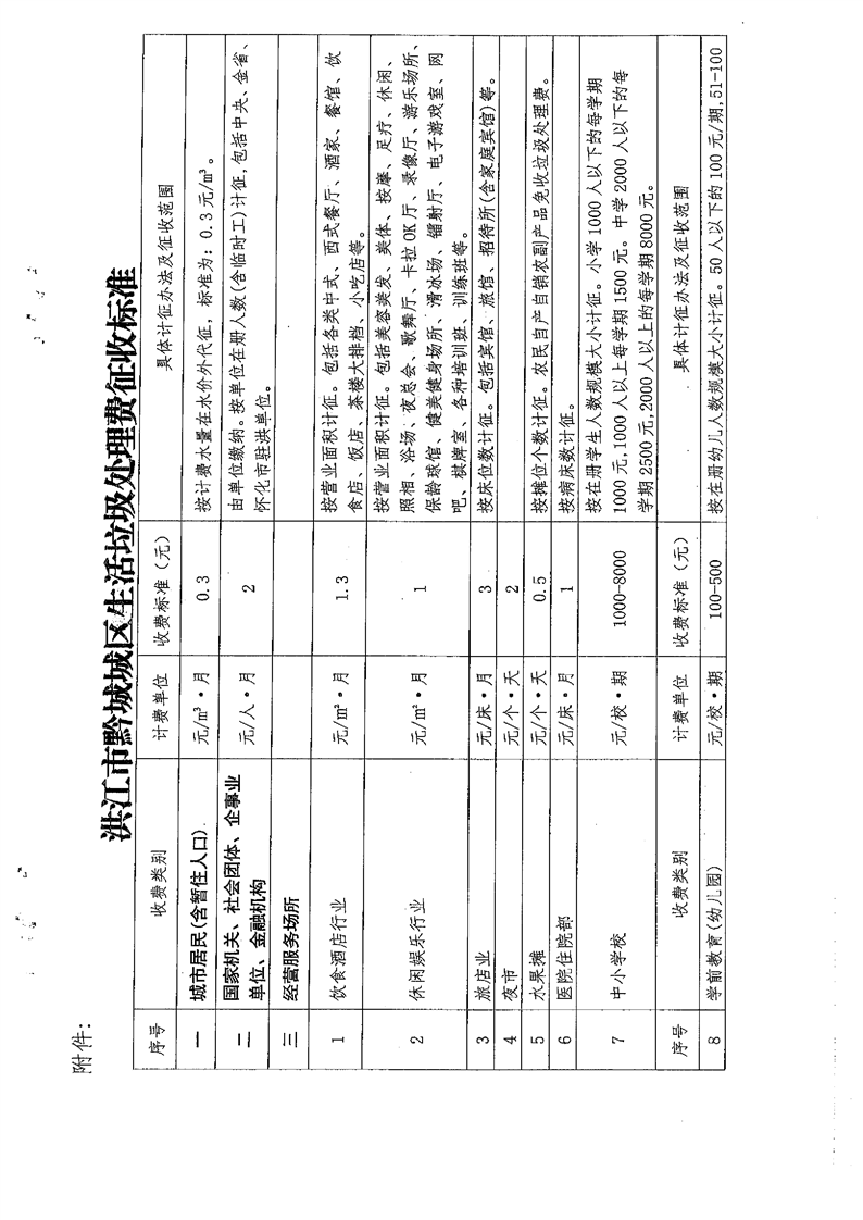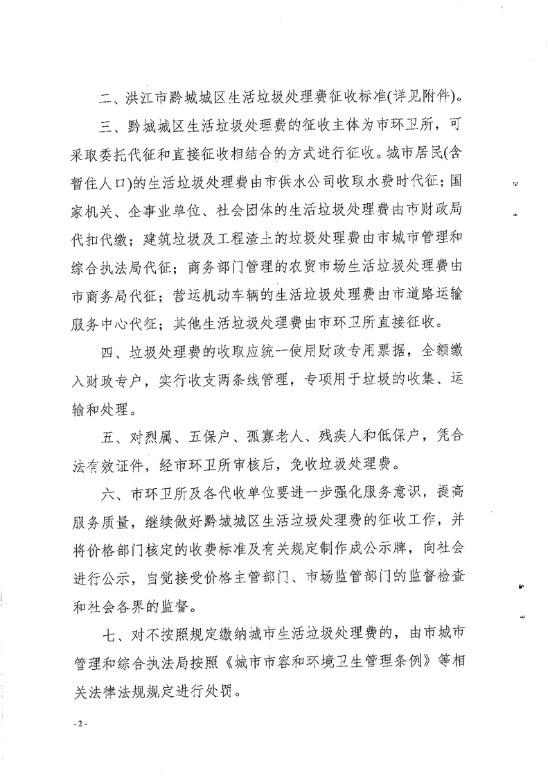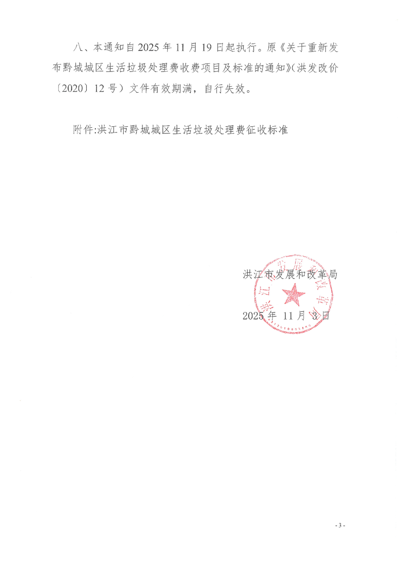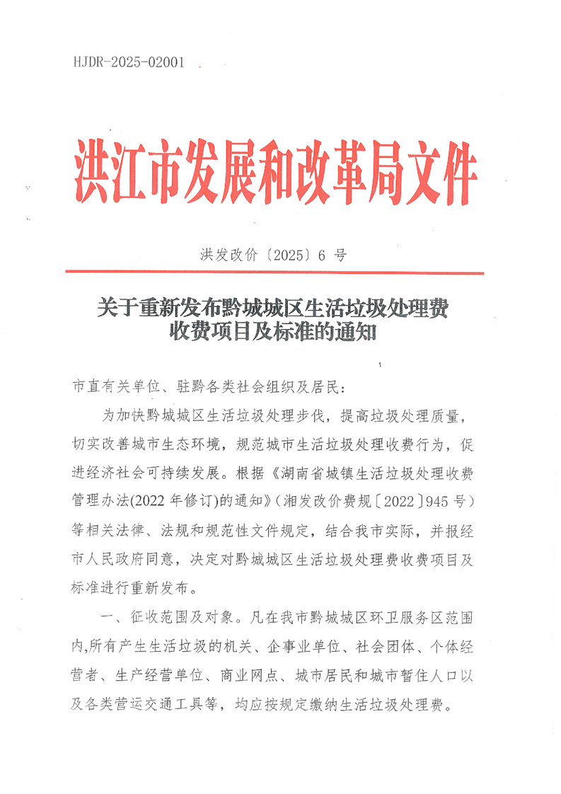 关于重新发布黔城城区生活垃圾处理费收费项目及标准的通知 洪发改价(2025)6号