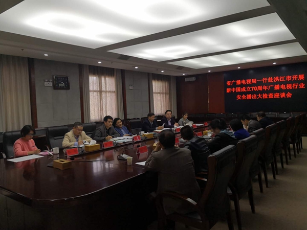 4月16日下午,省广播电视局党组成员、副局长蒋强先一行来洪江市开展新中国成立70周年广播电视行业安全播出大检查。检查组一行先对洪江市融媒体中心建设进展情况、广播电视安全播出情况进行了现场检查,随后举行了座谈。会议强调安全播出事关意识形态安全,各级各部门要提高认识,进一步建立健全各项制度,要明确责任、督促检查、加强演练,确保安全播出。怀化市文化旅游广电体育局党组成员、副局长龚兆逗,洪江市委常委、宣传部部长杨卫,洪江市人民政府副市长宫艳,以及洪江市文化旅游广电体育局、洪江市融媒体中心、洪江市网络公司等部门负责人陪同检查。
