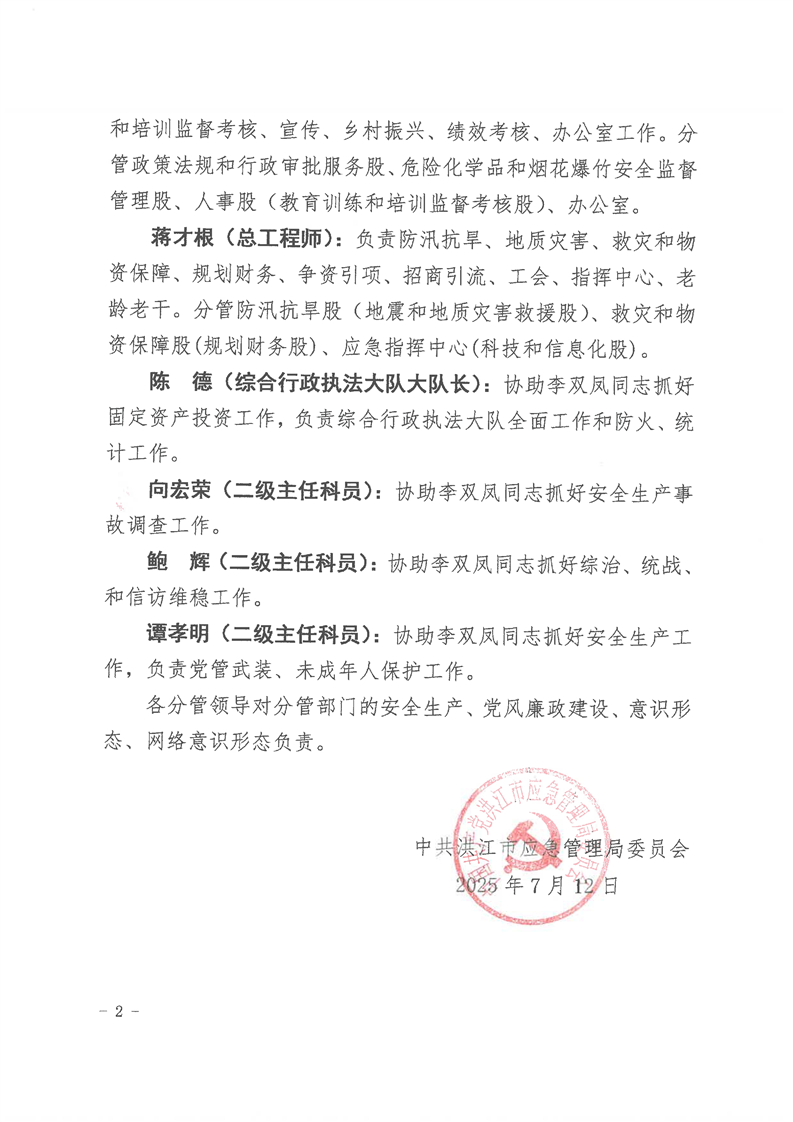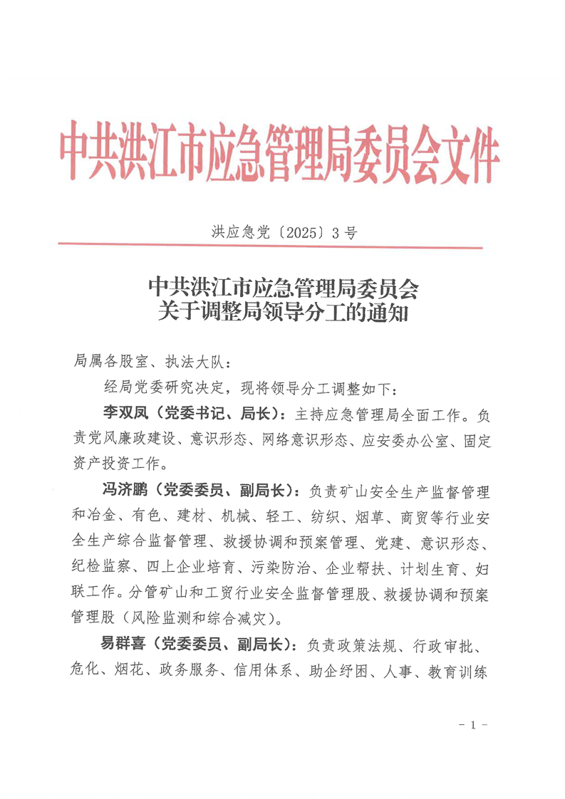 中共洪江市应急管理局委员会关于调整局领导分工的通知 洪应急党〔2025〕3号