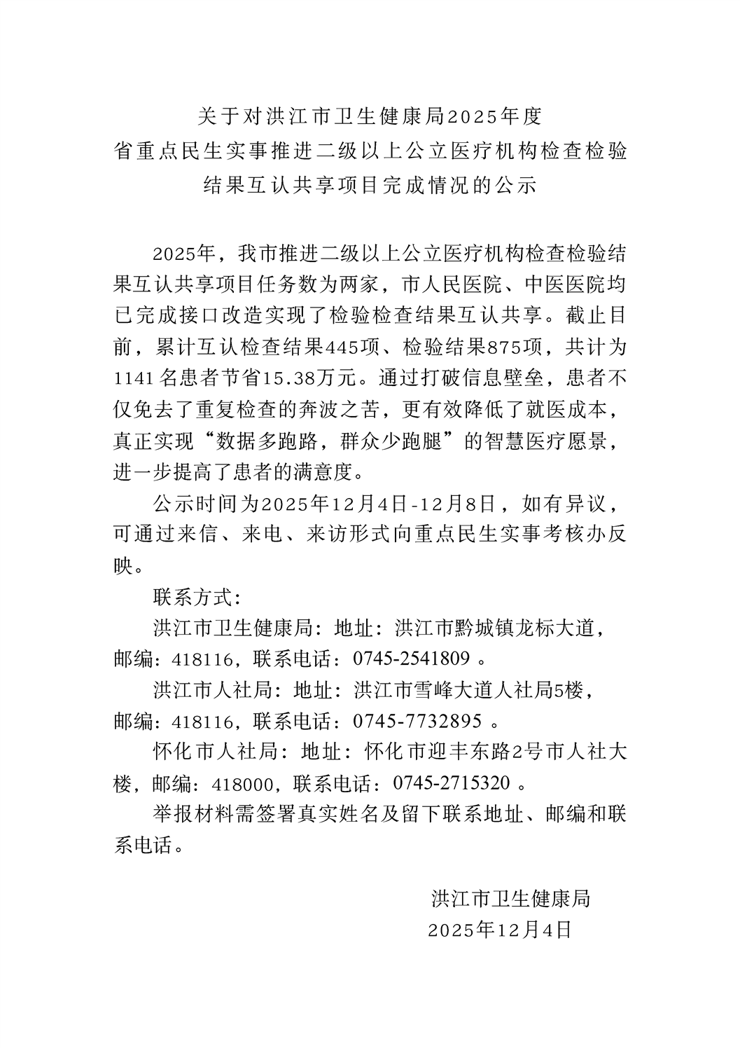 关于对洪江市卫生健康局2025年度省重点民生实事推进二级以上公立医疗机构检查检验结果互认共享项目完成情况的公示