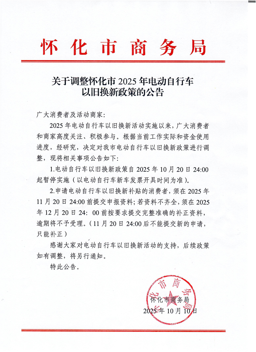 关于调整怀化市2025年电动自行车以旧换新政策的公告