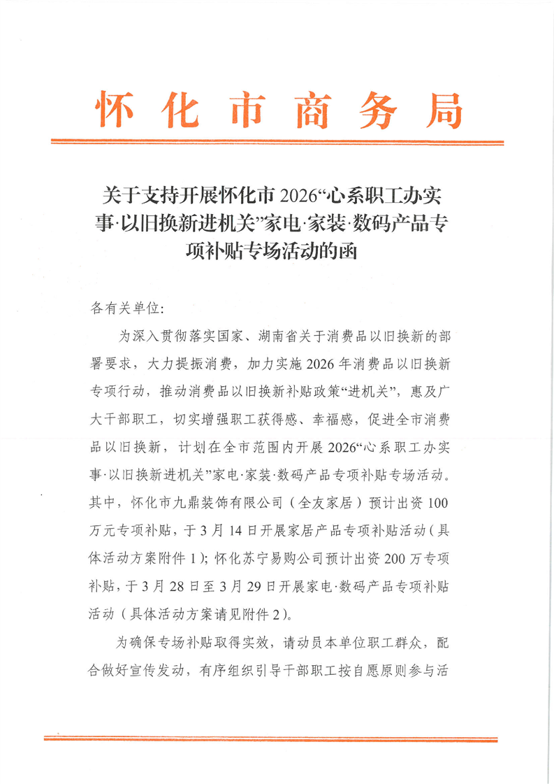 关于支持开展怀化市2026“心系职工办实事·以旧换新进机关”家电·家装·数码产品专项补贴专场活动的函