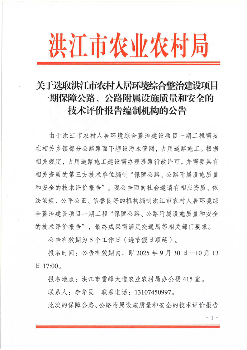 关于选取洪江市农村人居环境综合整治建设项目一期保障公路、公路附属设施质量和安全的技术评价报告编制机构的公告