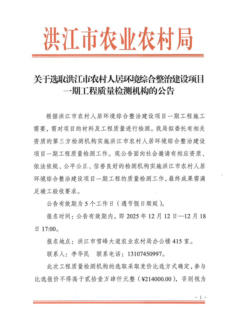 关于选取洪江市农村人居环境综合整治建设项目一期工程质量检测机构的公告