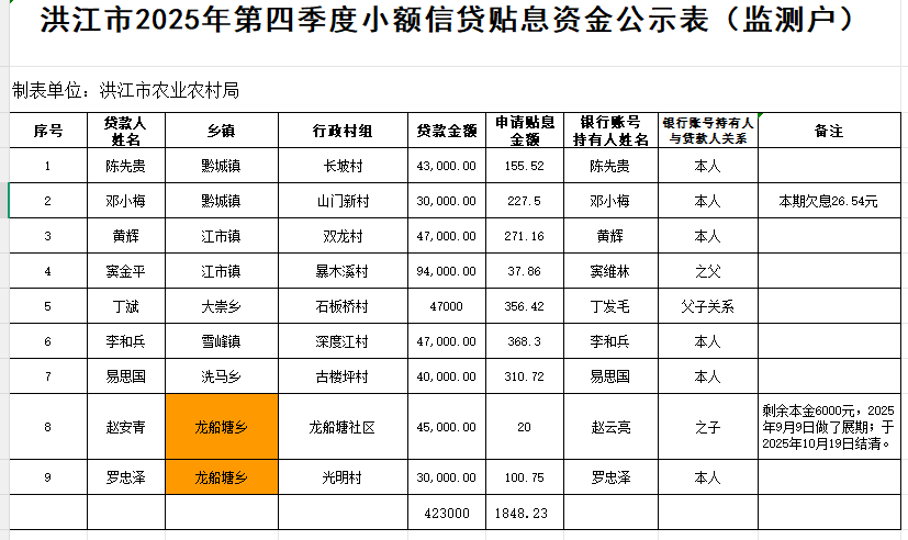 根据《洪江市乡村振兴局2025年小额信贷贴息实施方案》,现就2025年第四季度扶贫小额信贷贴息情况公示如下: