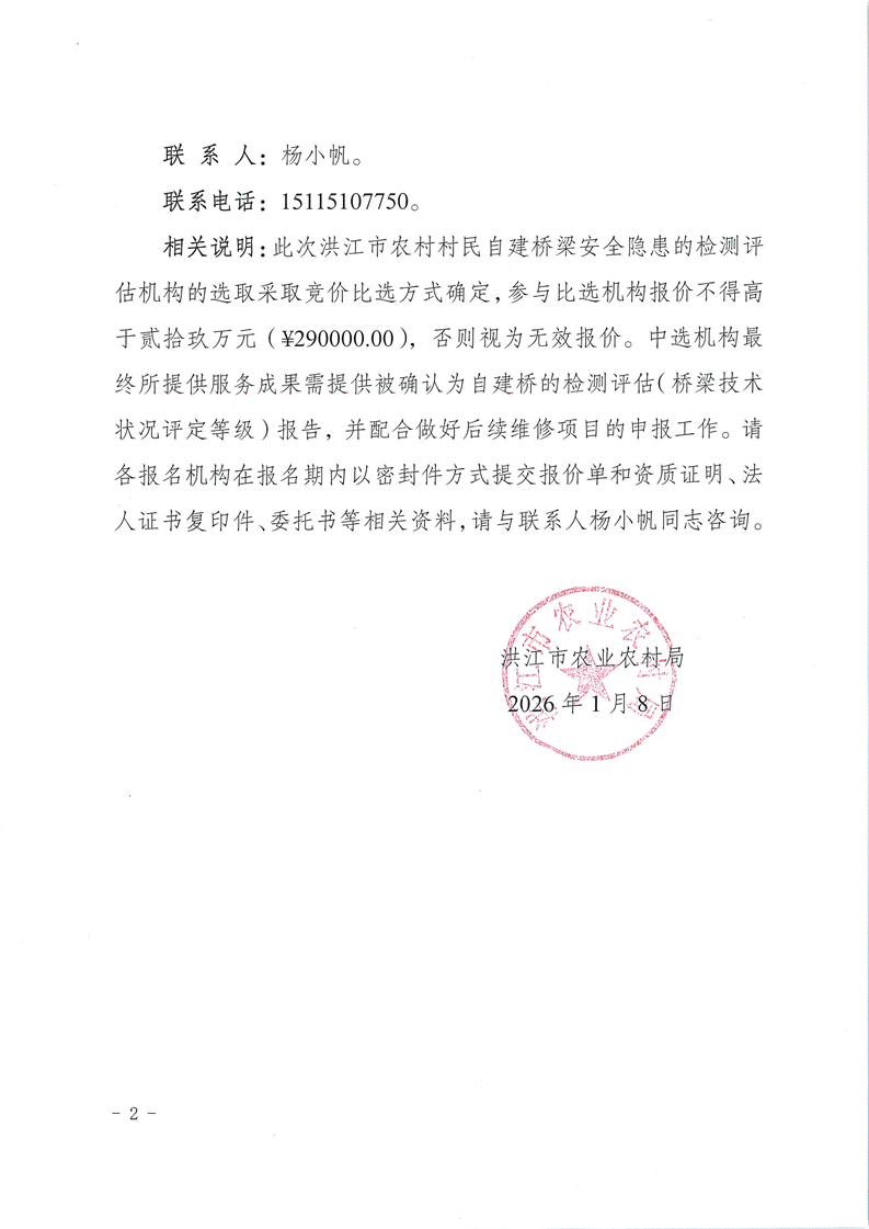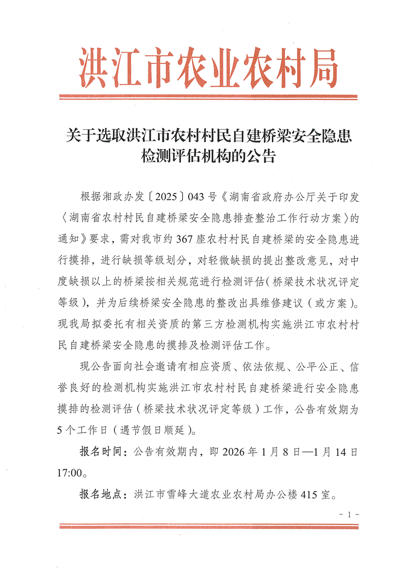 关于选取洪江市农村村民自建桥梁安全隐患检测评估机构的公告