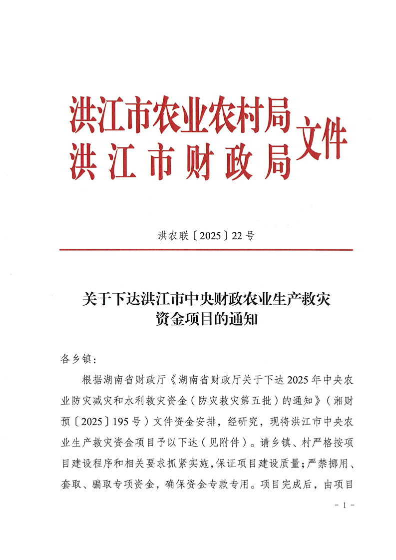 关于下达洪江市中央财政农业生产救灾资金项目的通知