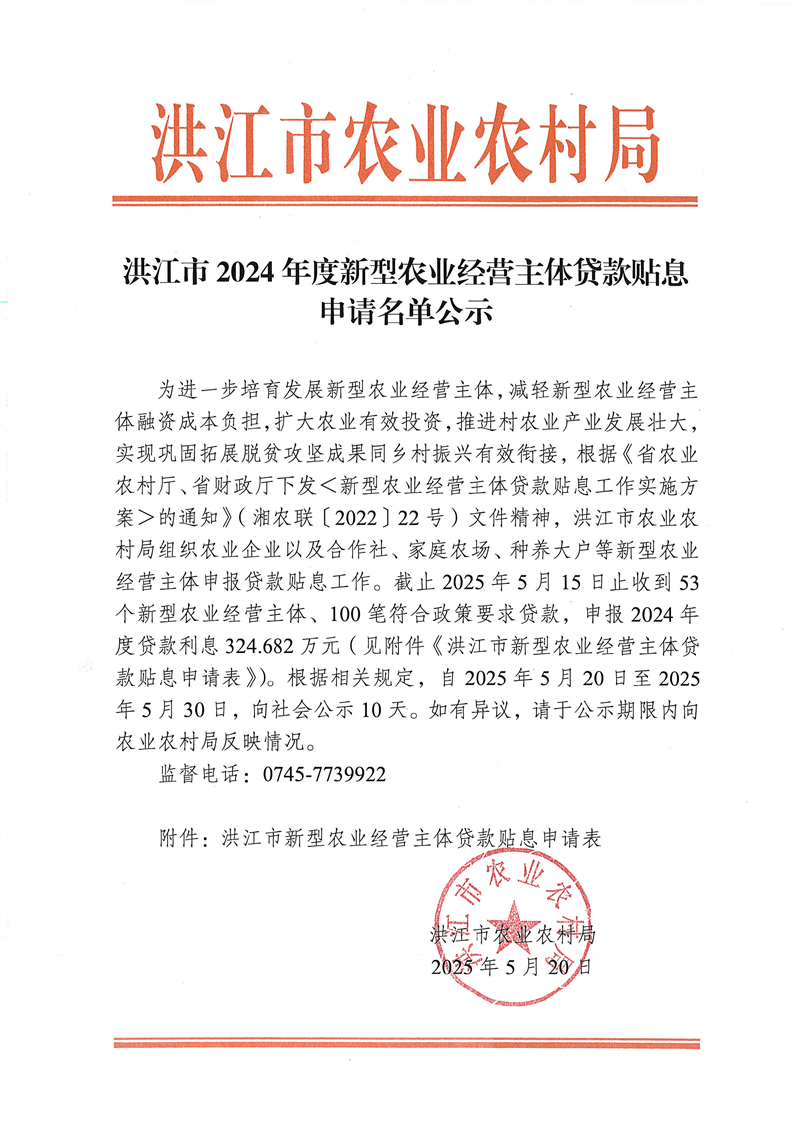 洪江市2024年新型农业经营主体贷款贴息申请名单公示