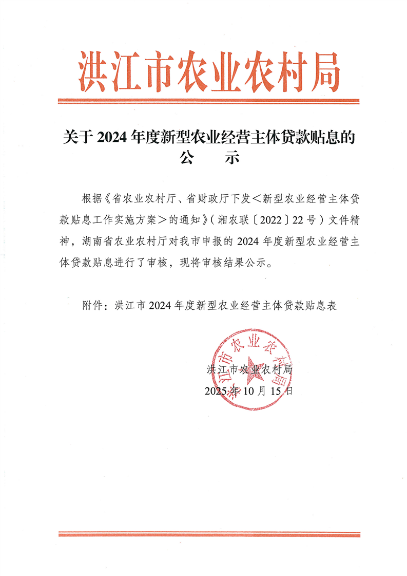 关于洪江市2024年度新型农业经营主体贷款贴息的公示