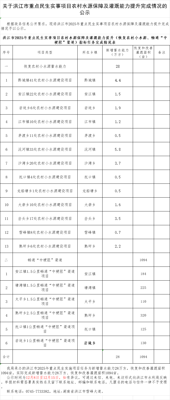 关于洪江市重点民生实事项目农村水源保障及灌溉能力提升完成情况的公示