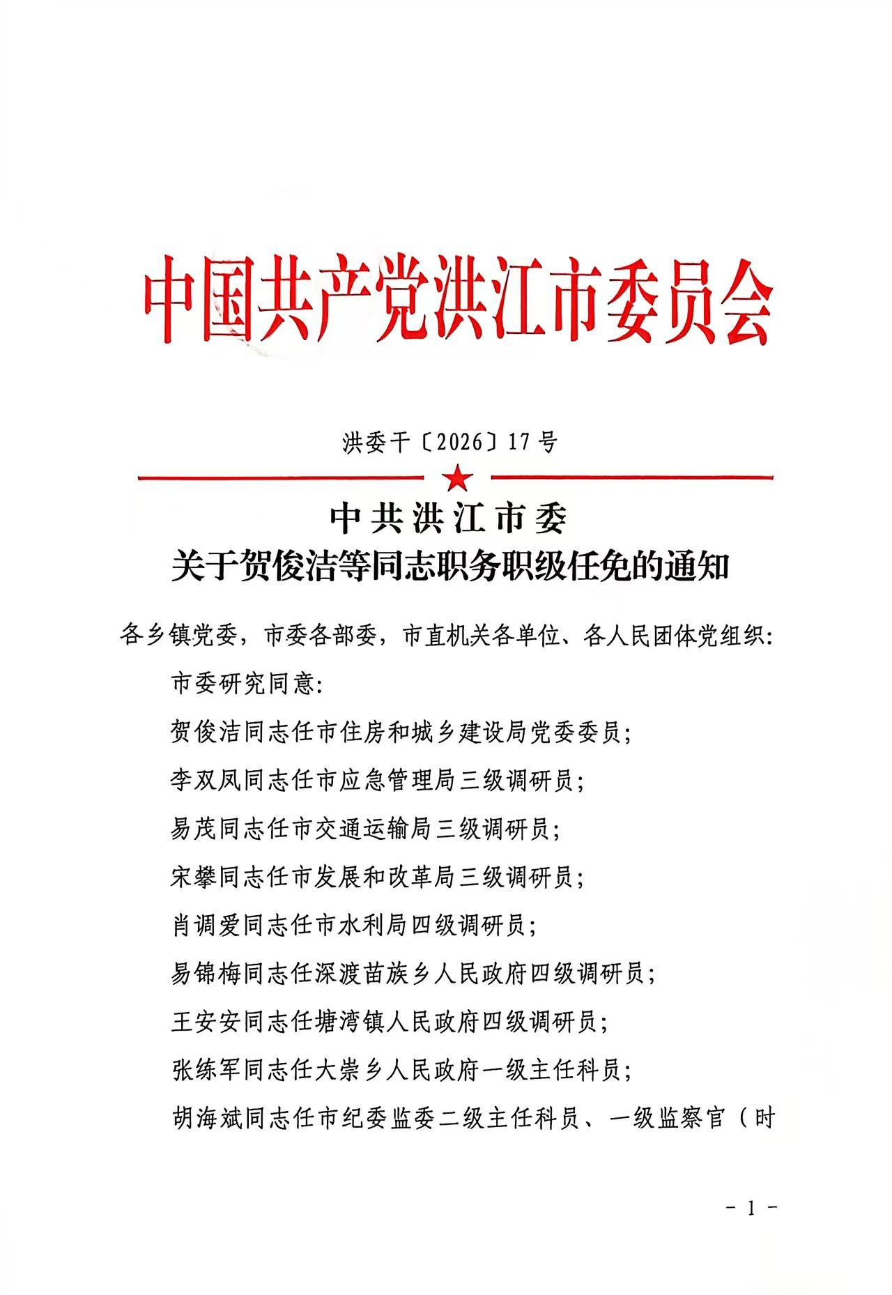中共洪江市委关于贺俊洁等同志职务职级任免的通知