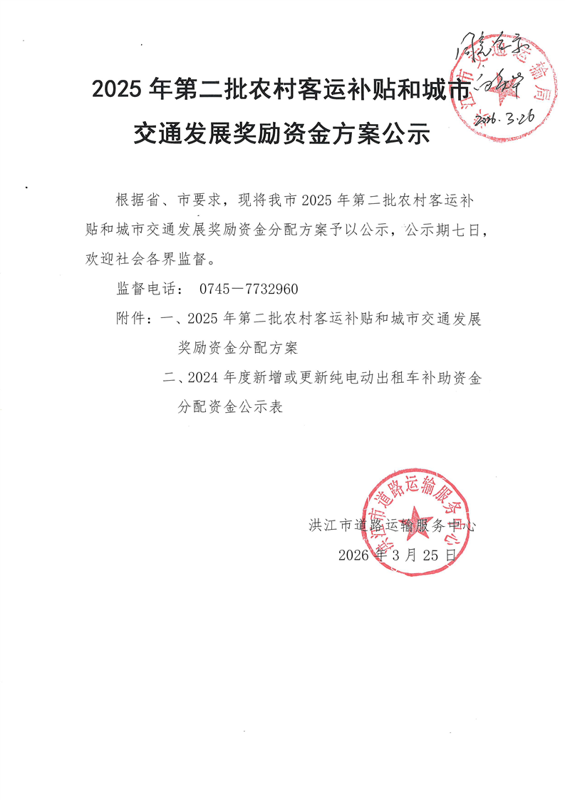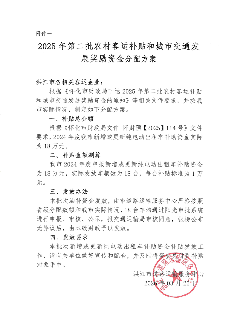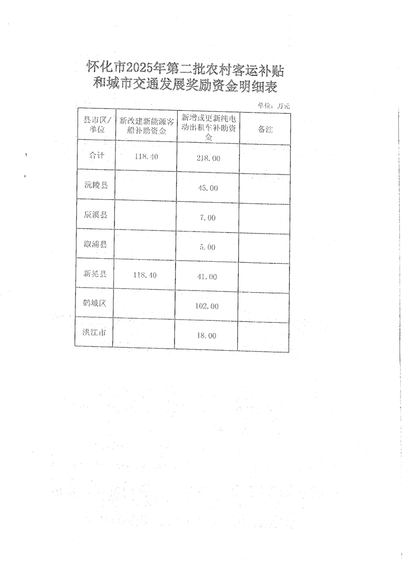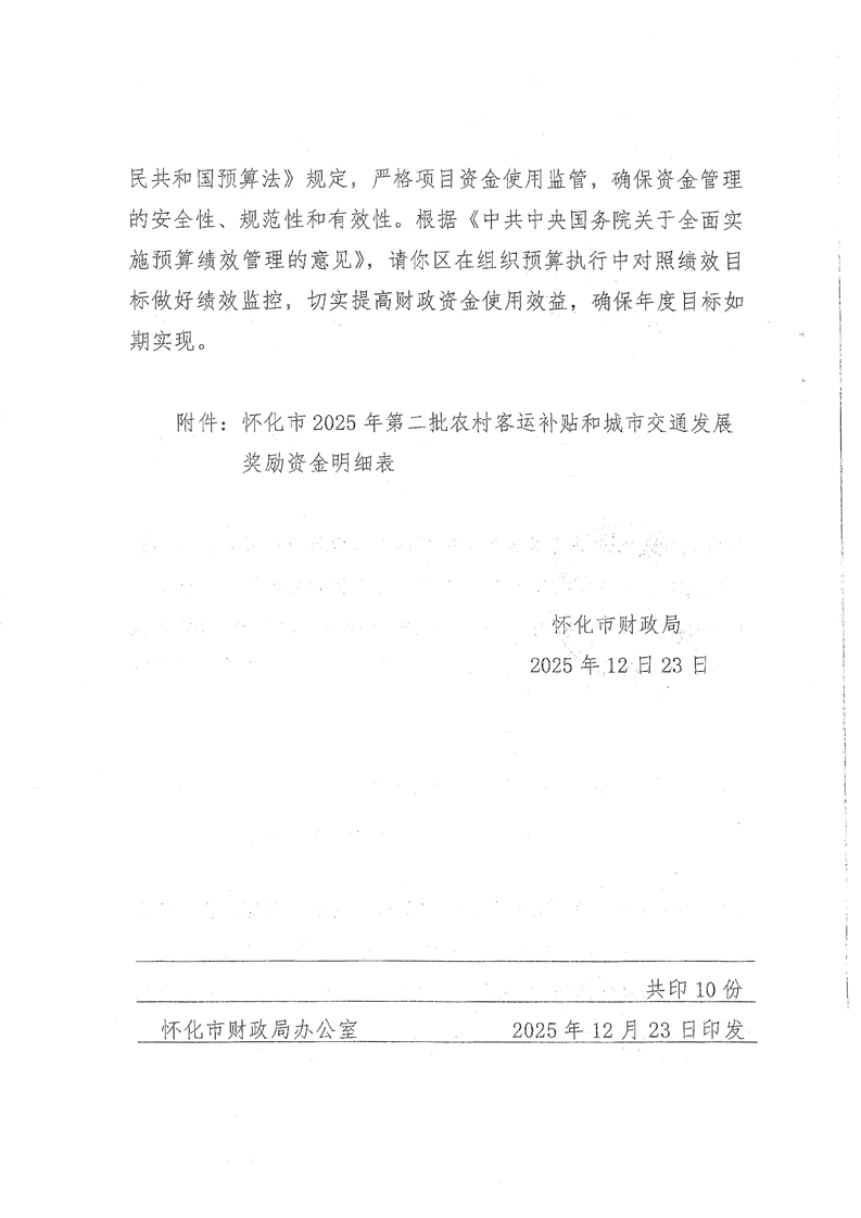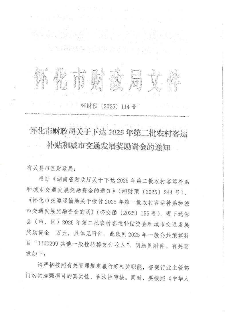 怀化市财政局关于下达2025年第二批农村客运补贴和城市交通发展奖励资金的通知