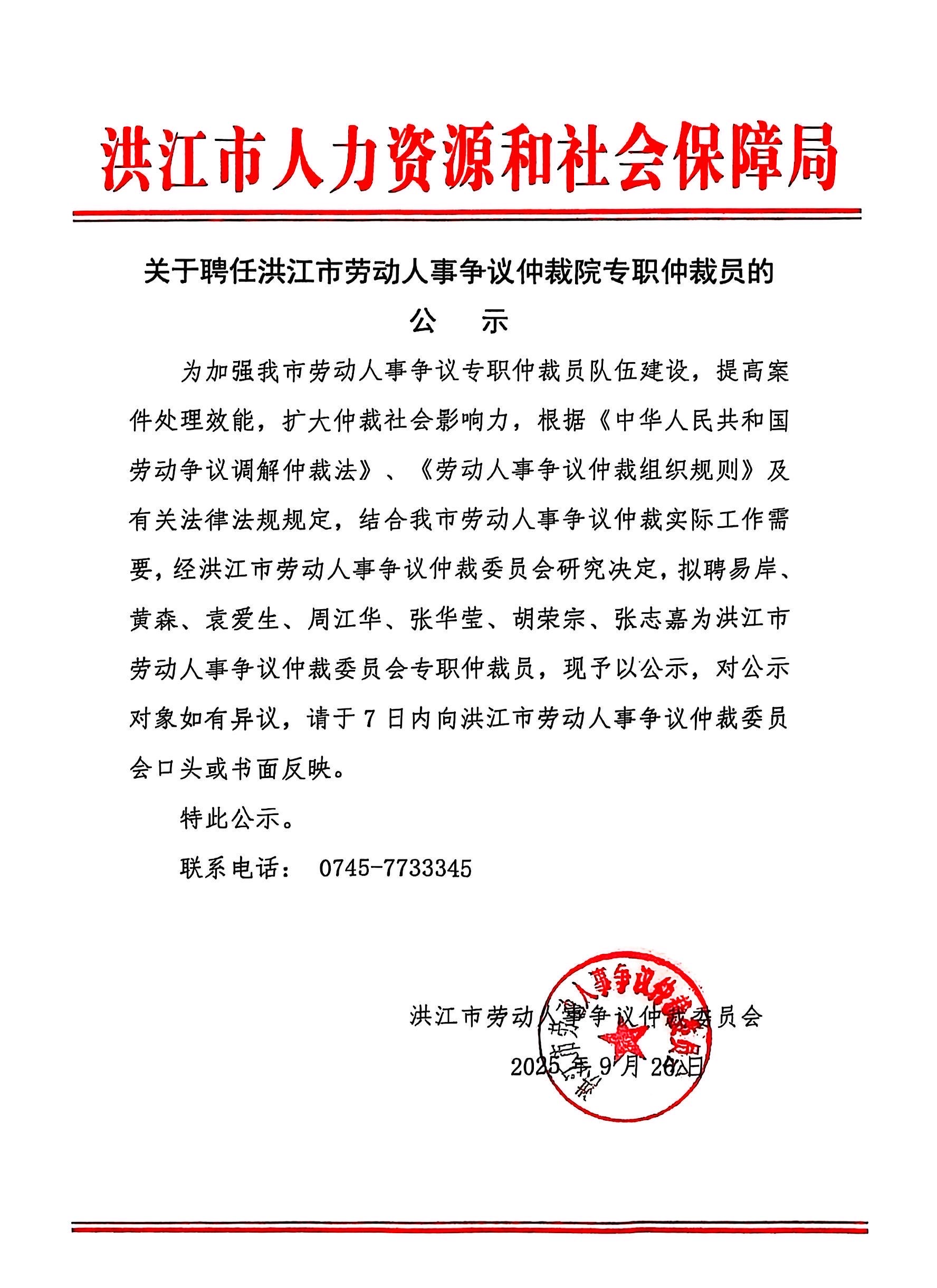 2025年关于聘任洪江市劳动人事争议仲裁院专职仲裁员的公示