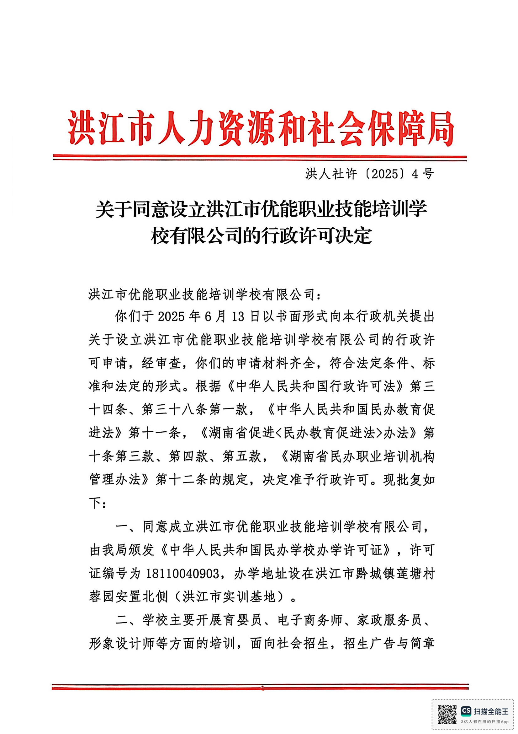 关于同意设立洪江市优能职业技能培训学校有限公司的行政许可决定