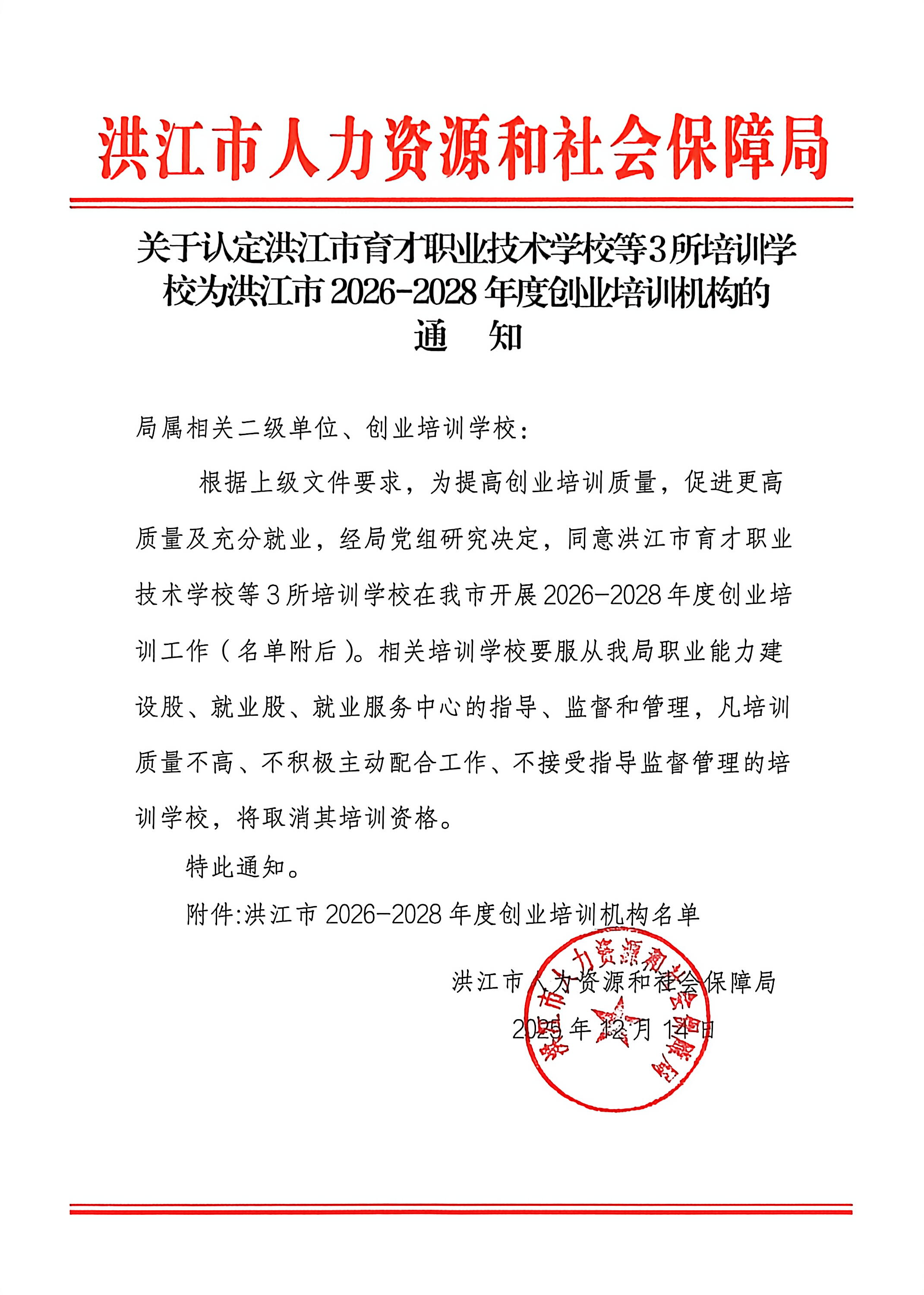 关于认定洪江市育才职业技术学校等3所培训学校为洪江市2026-2028年度创业培训机构的通知