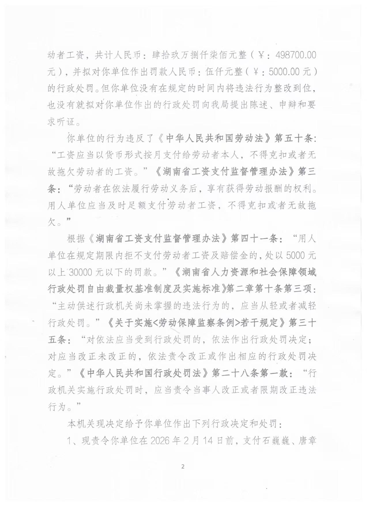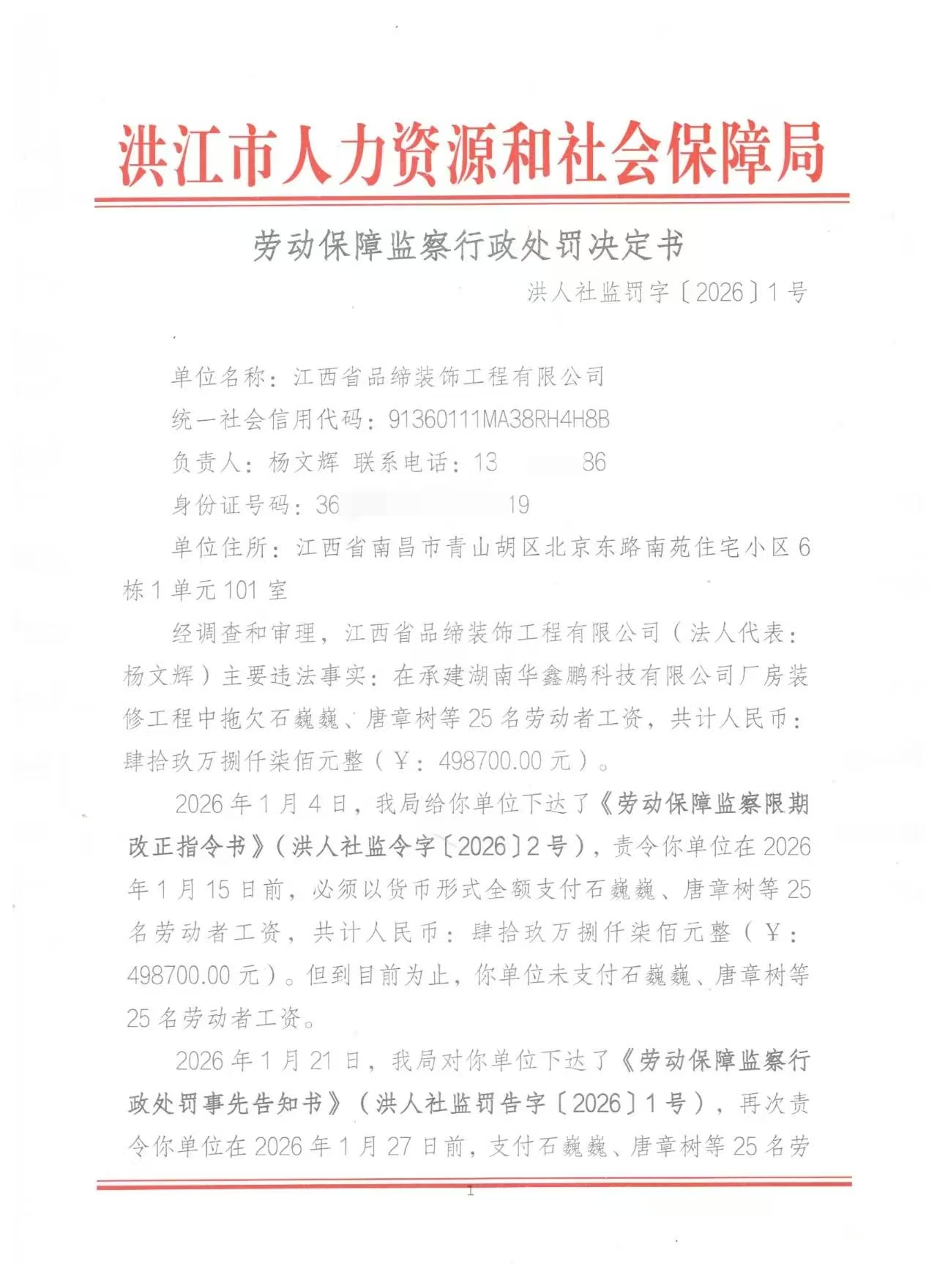 劳动保障监察行政处罚决定书 洪人社监罚字〔2026〕1号